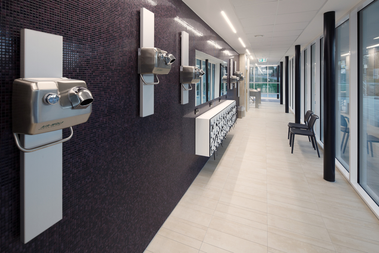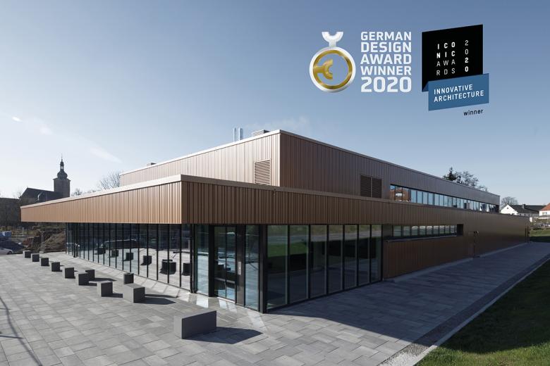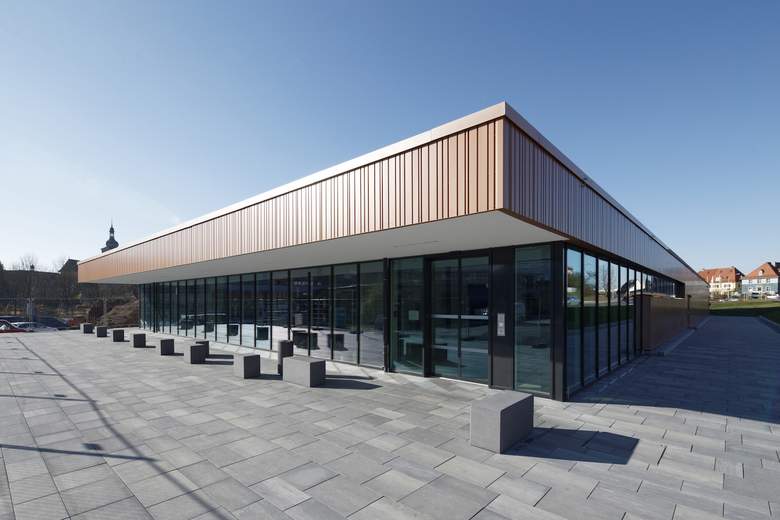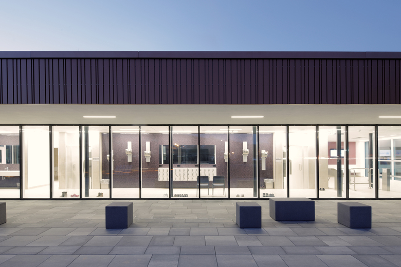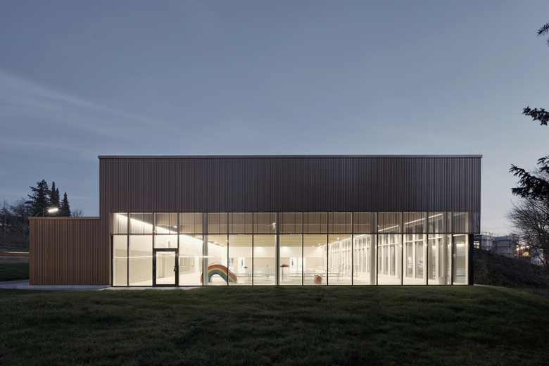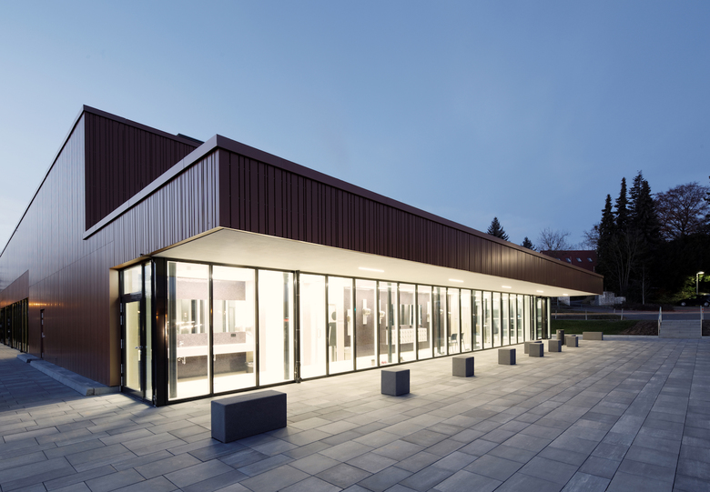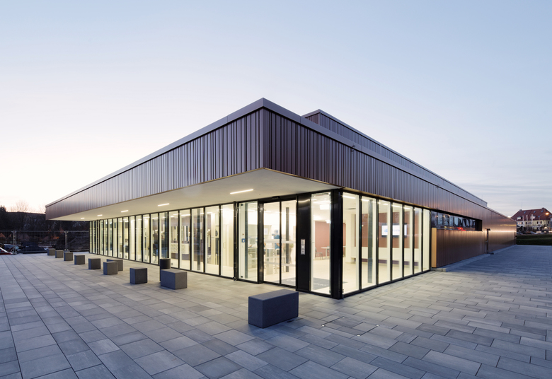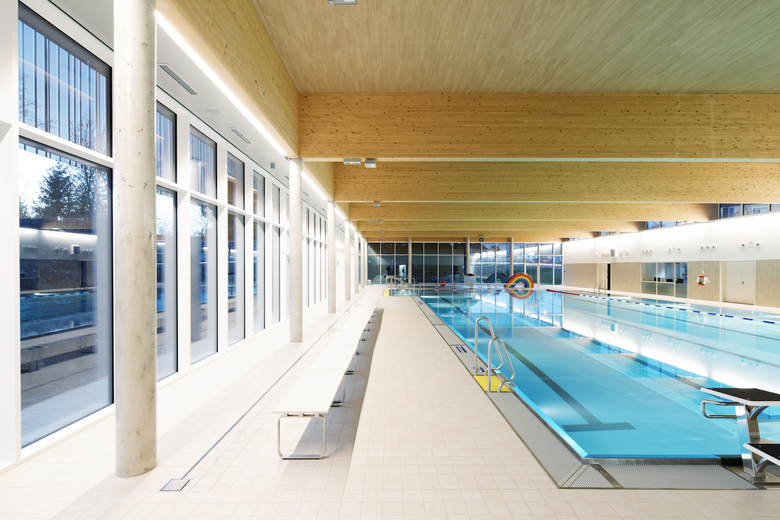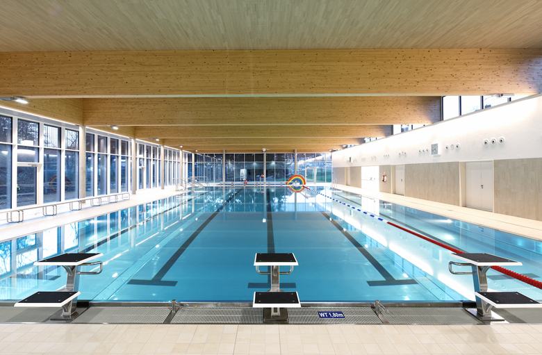 Die beiden an das Schwimmbad zu stellenden Anforderungsprofile, einerseits die Doppelübungsstätte nach Sportstättenempfehlung, andererseits die öffentliche Nutzung nach den Bäderrichtlinien, wurden so synergetisch wie möglich kombiniert. Alle Funktionseinheiten, wie Foyer, Umkleide, Badeplatte und Personalräume, sind erdgeschossig angeordnet. Die Schwimmhalle selbst beherbergt das 25-m-Becken und einen Kinderspielbereich der wiederum in ein Kleinstkinderbecken (Planschen, Wassergewöhnung) und in einen Bereich für etwas größere Kinder gegliedert ist ("Splash-Pads", Wasserspiele, Eimer, Spritzen etc.). Um die Becken herum gibt es ausreichend Sitzgelegenheiten und einen Liegebereich an der Südwestfassade. Eine Wärmebank gewährleistet die notwendige Abtrennung zwischen dem Kinderbereich und dem Nichtschwimmerteil des 25-m-Beckens. Die Konstruktion der Schwimmhalle wird als Stahlkonstruktion mit Brettschichtholzbindern konzipiert. Das Fassadenkonzept sieht eine lichtdurchlässige Fassadenbekleidung vor, die den Baukörper umgibt und in Teilbereichen auch vor den verglasten Flächen des Bades verläuft. Durch einen großen Verglasungsanteil in der Schwimmhalle wird eine optimale Tageslichtausnutzung gewährleistet. Die gewählten Materialien gewährleisten eine hohe Lebensdauer, sind wenig wartungsintensiv und somit lebenszyklusoptimiert.