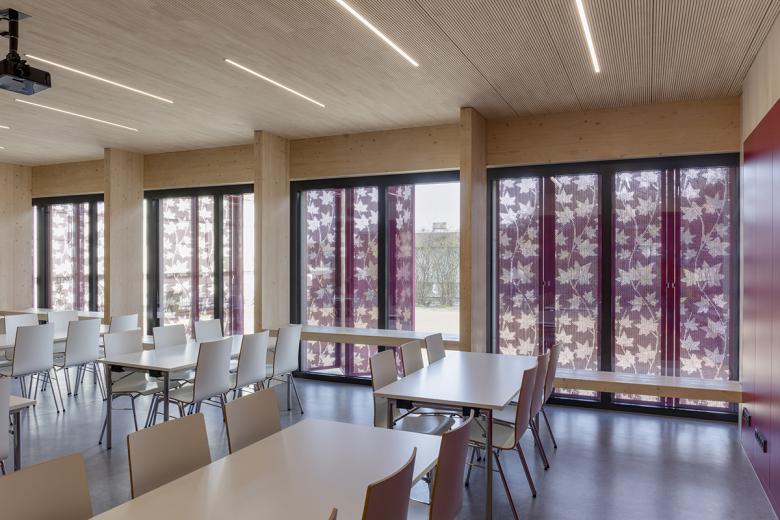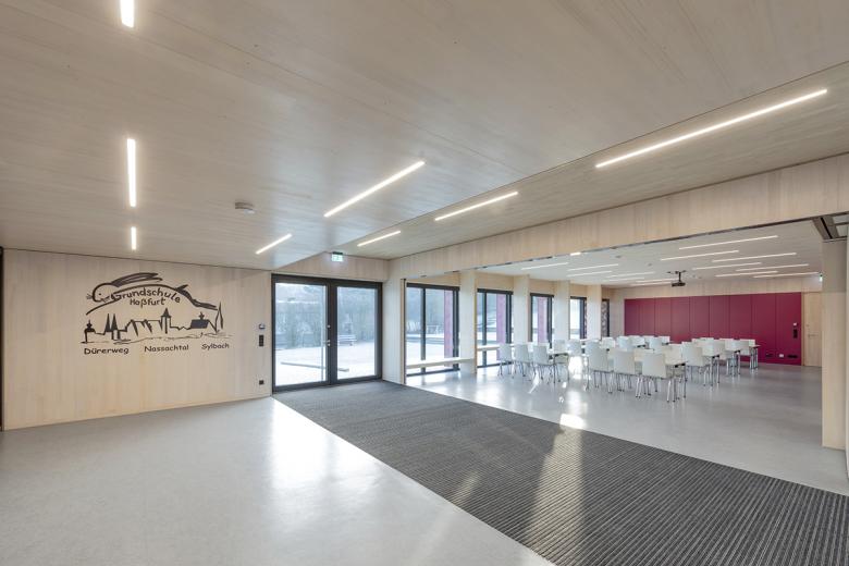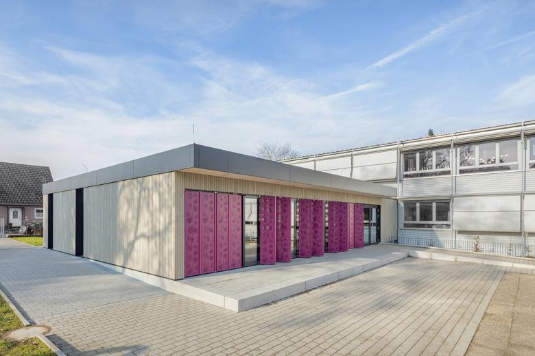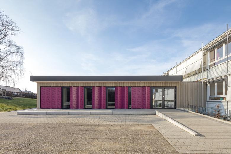 Die Grundschule wurde in den 60er Jahren als weitgehend offenes und transparentes Gebäude errichtet. Die Abmessungen des Hauptgebäudes betragen ca. 40,1m in Ost-West-Richtung und ca.16,7m in Nord-Süd-Richtung. Im Süden des Hauptgebäudes ist eine eingeschossige Aula angebaut mit den Abmessungen von 9,5m in Ost-West-Richtung und ca.19,3m in Nord-Süd-Richtung, welche im Rahmen des Mensaneubaus abgerissen wird und durch einen eingeschossigen Holzbau mit Flachdach ersetzt wird. Der Mensaneubau bildet sich auf dem Fußabdruck der abzureißenden Aula ab und wird in westlicher Richtung um die Funktionsräume erweitert. Im Anschlussbereich ist die Höhe des Neubaus an den Bestand angepasst. Der zweckdienliche Versprung der Gebäudehöhe zum Mensaraum erlaubt eine großzügige Dachauskragung, die zugleich eine Willkommensgeste mit Vordachsituation für den Haupteingang darstellt. Diese fasst das Gebäude als umlaufendes Band ein und bildet den oberen Abschluss der Holzfassade. Im Rahmen der Vorplanung wurde eine Sanierung der bestehenden Aula mit Erweiterung einem Abbruch mit Neubau gegenübergestellt. Aufgrund der nicht erhaltenswerten und schadstoffbelasteten Bausubstanz stellte sich der Neubau unter Berücksichtigung der Kosten als Lösung heraus. Zudem wurde sich für die Umsetzung als Holzbau entschieden um eine kurze Ausführungszeit des Rohbaus gewährleisten zu können. Die Haupterschließung erfolgt weiterhin über die Straße "Steigpfad", hier führt sowohl ein abgetreppter Weg als auch eine barrierefreie Zuwegung zum Haupteingang, welcher zwischen Hauptgebäude (nördlich) und Mensabereich (südlich) liegt. Im straßenabgewandten Teil des Geländes befindet sich der Pausenhof. Die gesamte Pausenhoffläche erhält einen neuen Pflasterbelag. Der Höhenunterschied des Hintereingangs der Mensa zum Pausenhof wird mit einer Sitzstufe überwunden und der Eingang über eine Rampe erschlossen, die als barrierefreier Zugang für die benachbarte Lebenshilfe ausgebildet wird. Neben dem topografischen barrierefreien Ausbau muss auch die befestigte Pausenhoffläche erneuert werden, um die normgerechte Entwässerung und Beleuchtung zu gewährleisten. Die vorhandene Höhenabstufung des Pausenhofs zur vorhandenen Grünfläche wird durch Sitzstufen abgefangen. Auf dem etwas höher liegenden Plateau finden zwei schattenspendende Bäume in gepflasterten Baumscheiben und ein Spielgerät Platz. Der vorhandene Wiesenbereich mit Bolzplatz, einem Spielgerät und dem alten Baumbestand bleibt unangetastet.