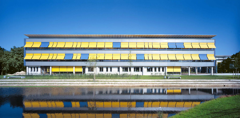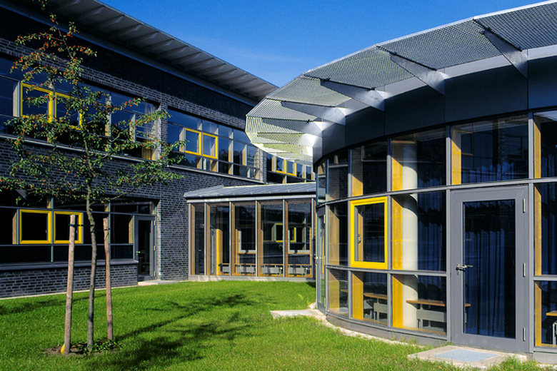 Das gestalterische Prinzip der linearen Baukörper schafft für die Schule zwei parallele Riegel, in denen die Unterrichts- und die Verwaltungsräume mit vorgelagerter Erschließungszone untergebracht sind. Die gläserne Eingangshalle und Aula stellt das Verbindungsglied der Baukörper dar.