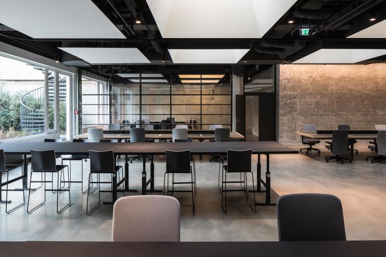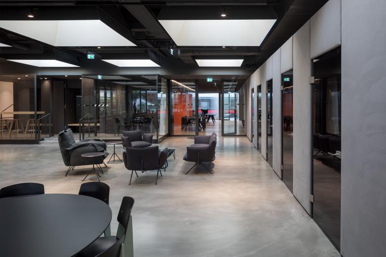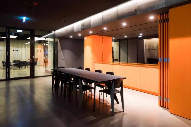 Der Eingangsbereich dient als Empfang, kann aber auch für informelle Besprechungen und kleinere Events genutzt werden. Die dafür notwendige Infrastruktur einer Küchenzeile verbirgt sich hinter einer leuchtorangen Wandverkleidung, gegenüber steht ein großes Sofa aus blauem Samt. Als zeitgemäße Interpretation der Großraumtypologie sind ergänzend zum anschließenden großen Arbeitsraum zahlreiche Möglichkeiten für Rückzug und Kommunikation gegeben, unter anderem Telefonboxen, Besprechungsräume oder eine Teeküche mit einer Mitarbeiter Lounge. Die langen Arbeitstische sind alten Bibliothekstischen nachempfunden, die Tischplatten aus gebürsteter, aufgehellter Eiche mit den typischen Intarsien aus dunklem Linoleum.