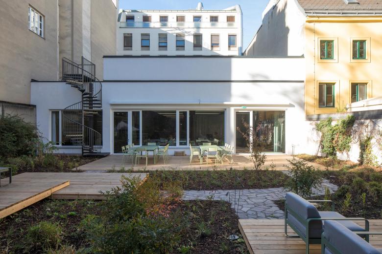 Eine raumhohe Verglasung ermöglicht den Mitarbeitern einen zu jeder Jahreszeit attraktiven Blick von innen nach außen. Die geschlossene Hofsituation wurde durch eine üppige Bepflanzung mit Sträuchern und Gräsern vergrößert. Der Garten lädt Team und Besucher auf drei Holzterrassen mit unterschiedlicher Größe und Setting zum Treffen und Verweilen ein. Eine große Holzterrasse verlängert den Innenraum nach Außen und lädt das gesamte Büro zum gemeinsamen Essen oder Arbeiten ein. Die zwei kleineren Terrassen bieten die Möglichkeit zum Rückzug und zu Besprechungen in kleineren Gruppen.