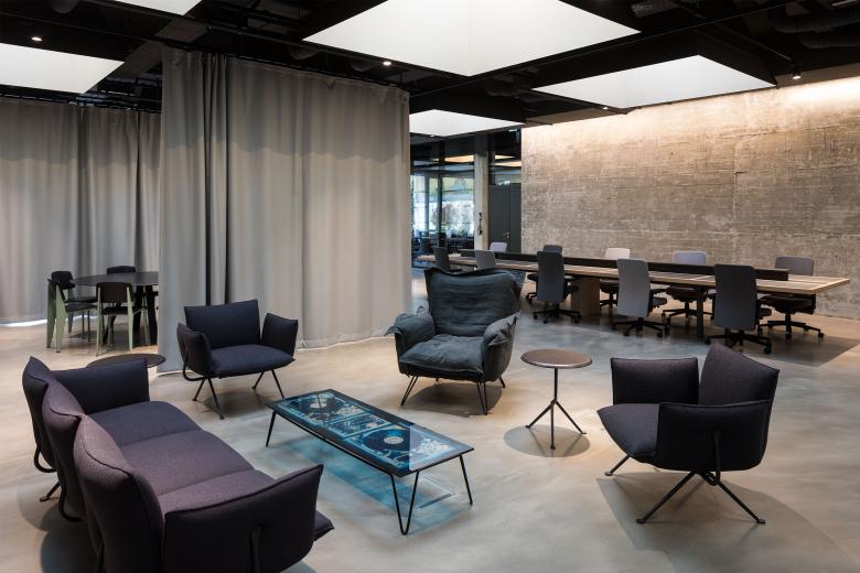 Über ein Schienensystem kann der Großraum mit einem, auch akustisch wirksamen Vorhang zusätzlich in verschiedene Bereiche geteilt werden. So kann schnell die eine Raumhälfte zu einem Vortragsraum für 60 Personen transformiert oder spontan ein runder intimer Besprechungsraum für ein Projektteam geschaffen werden.