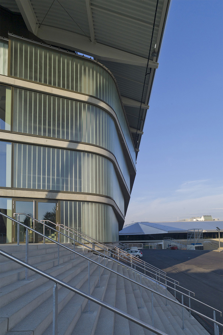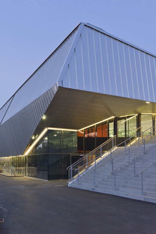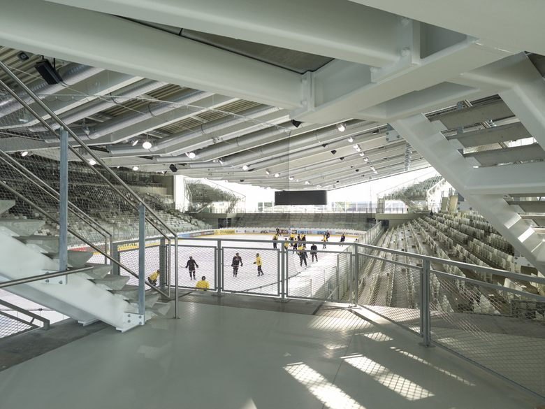 Die großen Tragwerke der Dächer scheinen die drei Hallen leicht zu überspannen, und geben großzügig den Raum für eine „promenade architecturale“ mit einer Abfolge von Durch- und Einblicken in die Eishallen und das Geschehen auf den Eisflächen frei. Der Umgang mit Licht, Transparenz, Materialität und Konstruktion bildet den durchgängigen architektonischen Leitfaden. So findet jede der drei Hallen ebenso wie das Restaurant, der Clubbereich oder der VIP Bereich, ihre eigene Position im Ganzen - und einen klaren Ausdruck.
