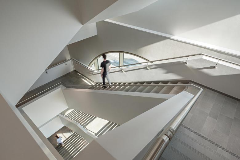 Wie beim Haus C kommt den beiden Haupttreppen eine große Bedeutung zu. Besonders die große Stiege 1 ist als dreidimensionaler Kommunikationsraum geplant. Alle Labors sind in den Obergeschoßen untergebracht und bedingen die innere Struktur des Gebäudes mit seinen funktionellen, großen Trakttiefen. Vorlesungs- und Übungsräume sowie Büros für die wissenschaftlichen Mitarbeiter und die Verwaltung ergänzen das Programm.