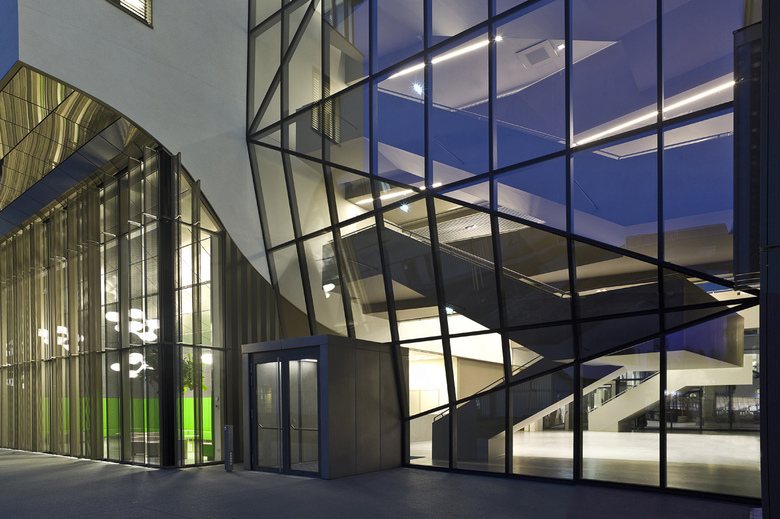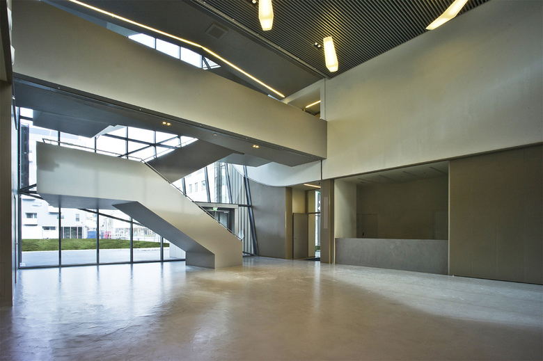 Die zweigeschossige Eingangshalle im Mittelteil, der „Marktplatz des Wissens“, kann auch für Feierlichkeiten und Empfänge genutzt werden. Von außen sichtbare Stiegen erstrecken sich skulptural entlang der gefalteten Fassade über alle Ebenen.
