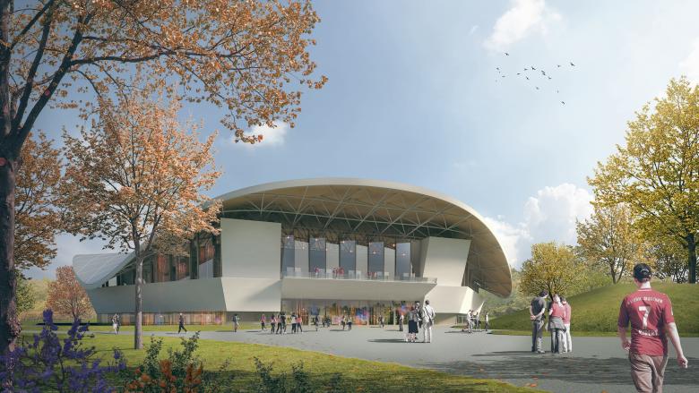 Ein scheinbar frei schwebendes Dach überdeckt die gesamte Arena mit ihren Umgängen und streckt sich schützend nach Osten über das vorgelagerte Foyer, um eine Verbindung zum tiefer liegenden Dach der Trainingshalle zu schlagen. Die auf- und abschwingende Dachlinie führt die Linien der umgebenden Landschaft weiter. Die Wellen des Daches heben dynamisch die Zugangsbereiche Nord, Süd und Ost auf natürliche Weise hervor. Die Auskragung des Daches schafft eine wettergeschützte Vor-Zone um das Gebäude, die an nassen und kalten Tagen die Wartezeit vor dem Matchbesuch angenehmer und attraktiver macht.