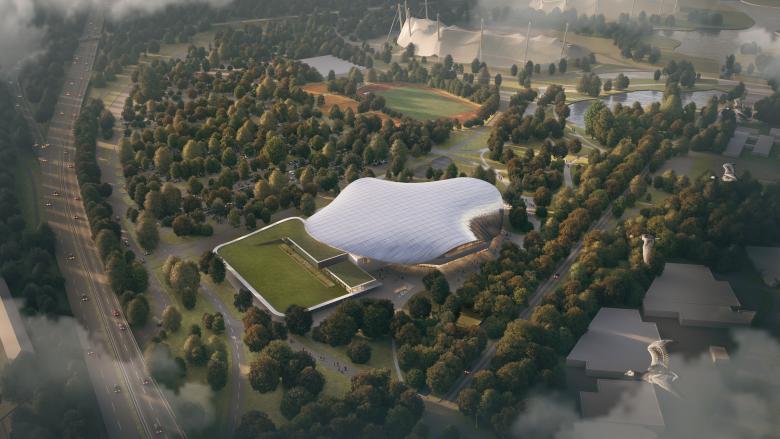 Die Integration einer modernen geschlossenen Wettkampfarena in das architektonisch ebenso wie historisch bedeutsame Olympiagelände stellt eine große Herausforderung dar. Um dieser Aufgabe gerecht zu werden führt der Entwurf folgende Hauptthemen des Olympiageländes weiter: Das Dach als frei ausschwingendes landschaftliches Element sowie die Tribünen als Elemente der Topografie und transparente Gebäudehüllen.