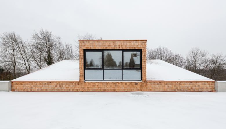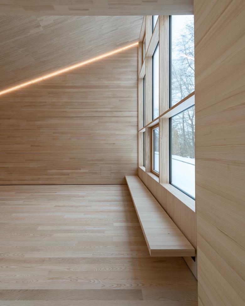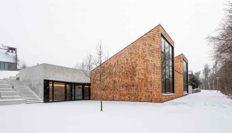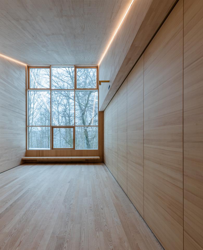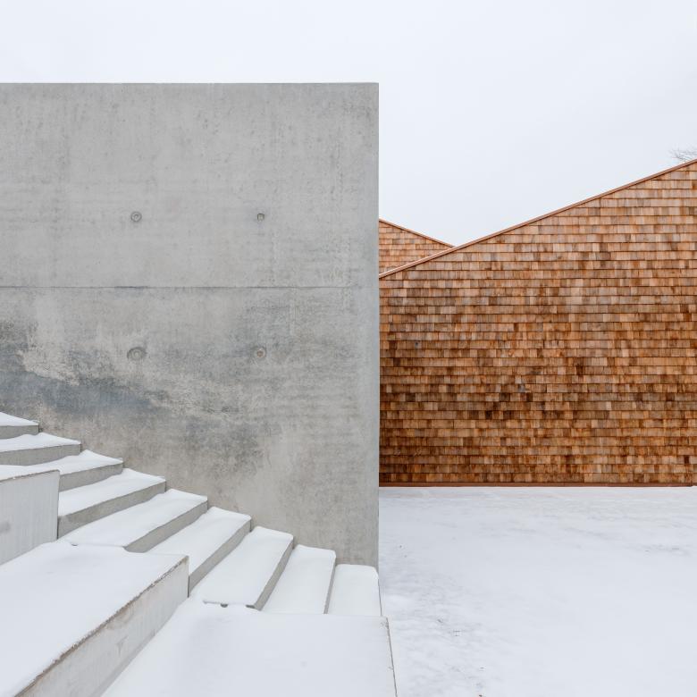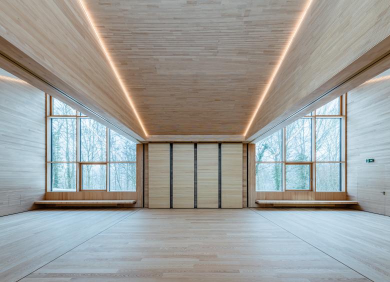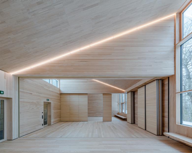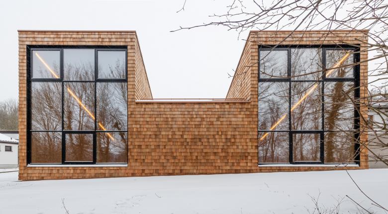 Das Haus 4 der Evangelischen Jugendbildungsstätte in Neckarzimmern steht aufgrund seiner zentralen Lage in der Gebäudeabfolge eine wichtige Rolle zu. Daraus entstand die Idee das Haus und sein Zugang auf die Ebene des Erschließungsweges herunter zu setzen und kompositorisch so einzuflechten, dass sich ein „Dorfplatz“ bildet, welcher zum Verweilen einladen soll. Formal betrachtet besteht das Haus aus zwei Körpern: eine Nebenraumspange, welche sich in den Hang einschiebt, und dem 3-teilbaren Saal, welcher sich durch sein bewegtes Pultdach in die sich hochstaffelnde Gebäudeabfolge eingliedert.