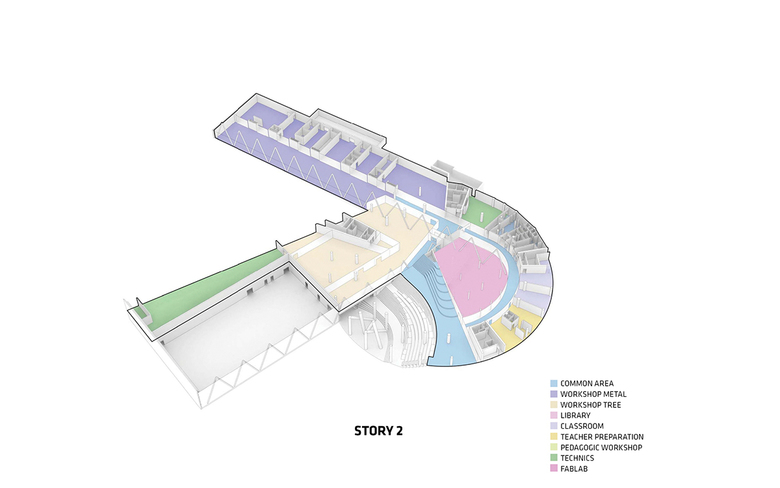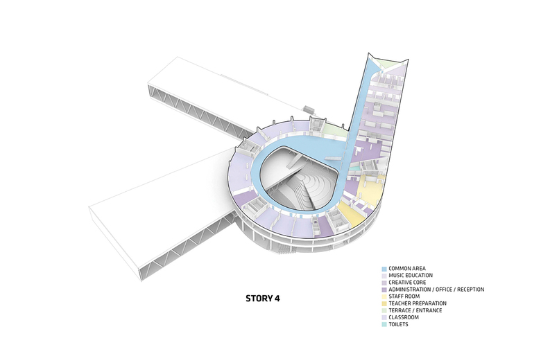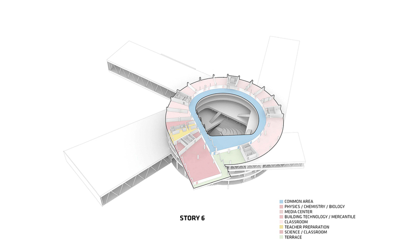 The main entrance of the school is accessible from a dramatic bridge due to the steep slope of the site. Students and teachers are immediately welcomed by the large circular courtyard which creates a natural gathering point across all floor levels and academic interests.