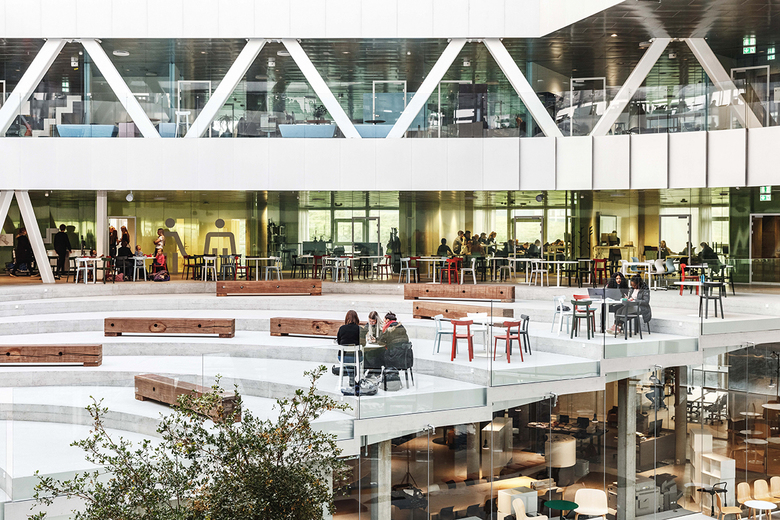 Designed as an extension and interpretation of the natural landscape, the 32m diameter indoor courtyard with terraced steps provide generous, flexible spaces for group meetings, social events and dining, as well as auditorium seating for larger events or announcements. Above, gigantic transparent skylights shelter the space from the wind and weather of the harsh Faroese climate while allowing abundant daylight into the atrium. The inner façades between the classrooms and courtyard are realized in colored glass, providing an intuitive overview of the different functions within the building.
