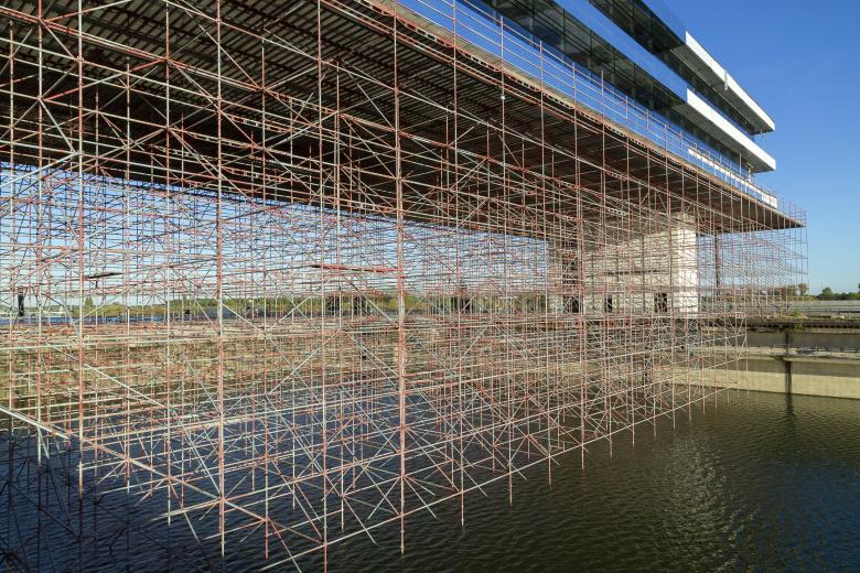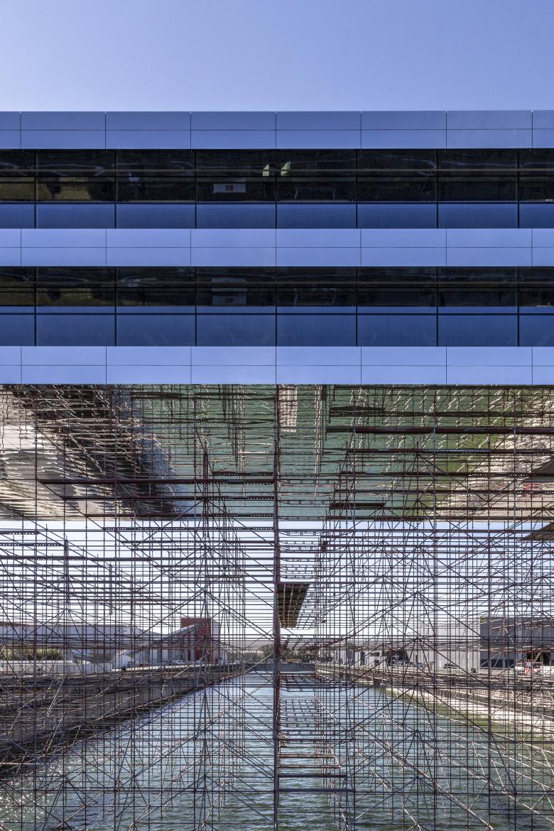 The existing dry dock is spanned in width by a steel structure of two double-high trusses with intermediate sleepers. It will be installed on two concrete building volumes that are 73 m apart, and that also contain the entrances to the office, each with two elevators and two staircases.