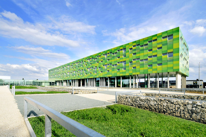 Diverse eco-innovative techniques such as a technical front wall with integrated photovoltaic panels, a borehole energy storage field (BEO field) and core concrete activation (BKA) have been applied throughout the building.