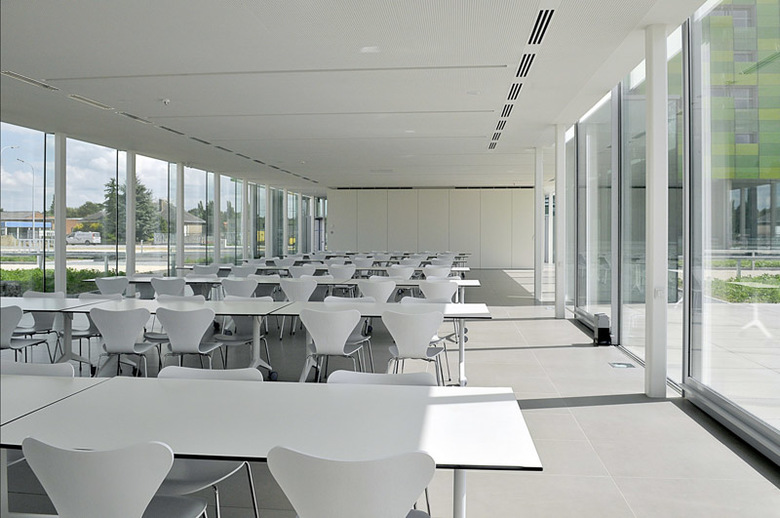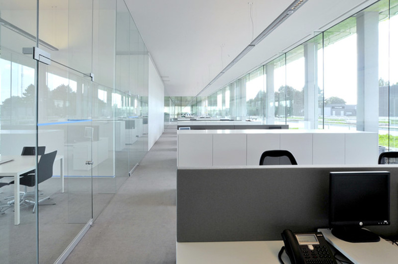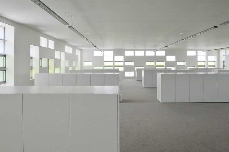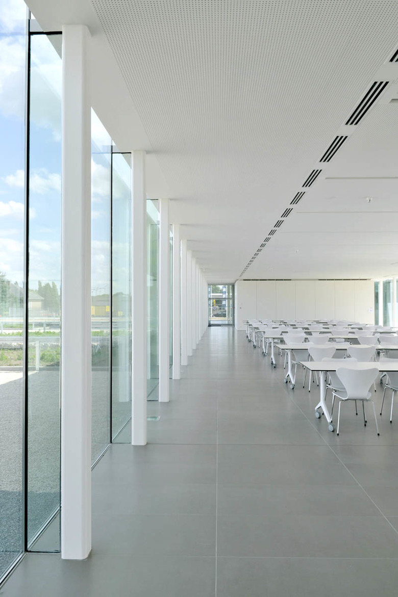 The outer skin consists of screen printed glass panels in 3 colours and three degrees of transparency. The mosaic formed by all these elements and the wall’s ingenious construction have made an unmistakable contribution to the building’s expressive and dynamic character. This technical ingenuity has been combined with unbroken space in the offices: A large free height of 3.40 m and a column-free span of 16 m have made the space airy and extremely flexible. The décor was deliberately kept restrained, using white as the main colour and warm shades of grey for the flooring and acoustic screens. A few carefully chosen black accents emphasise secondary functions and vertical circulation in the building.