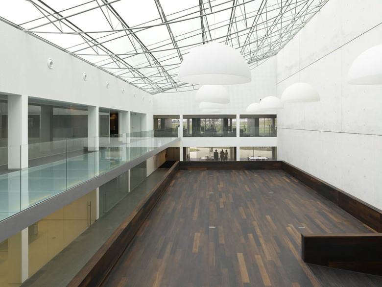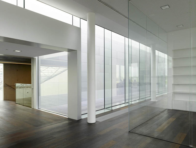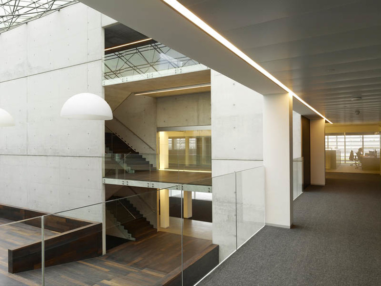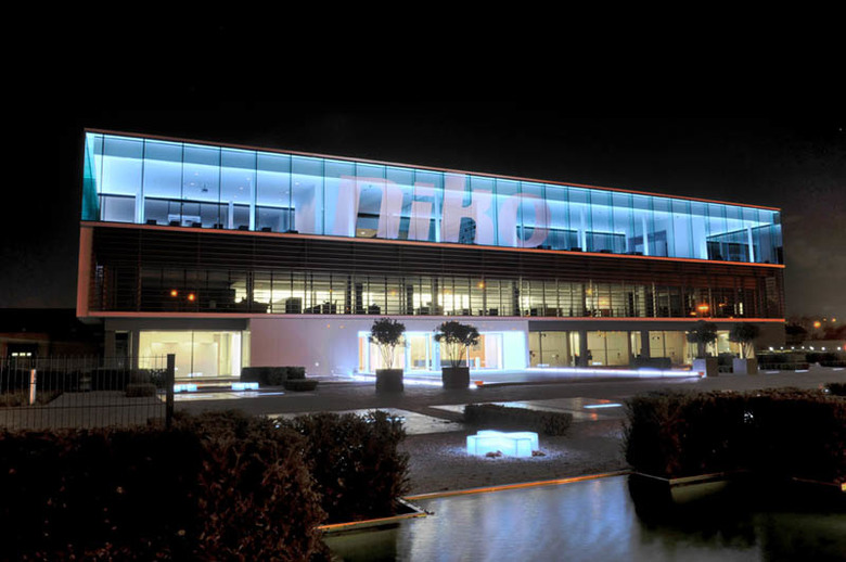 Jo Crepain: "Light is a special captivating medium to generate architecture and thereby attain a balanced composition. It is literally the illumination of spaces and the creation of atmosphere. At the basis of this its control systems and switches are indispensable. As an important exponent in this account the NIKO company wishes to thoroughly reorganize the existing offices and to rearrange them into a clear organization for the future. A large glass domed patio forms the central heart of the building. As an addition in the program and a cynosure to its surroundings, the new glass office box stands in a stately manner atop the existing building. Copper reflective Venetian blinds mask the existing buil-ding’s live wires around the office platform. A coloured evening atmosphere lights up like one great strip of light along the motorway."