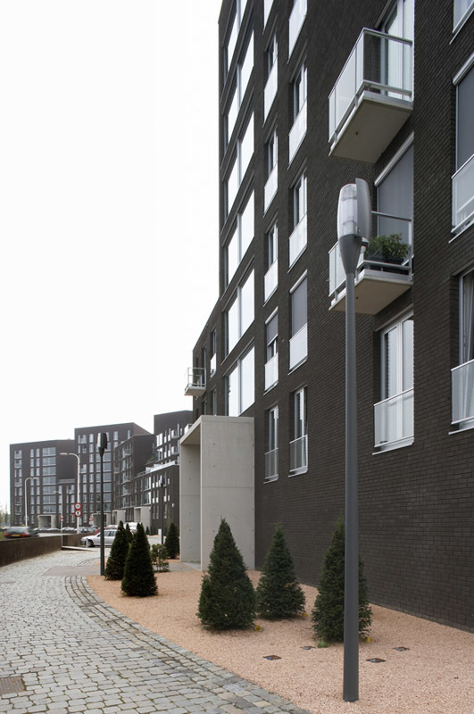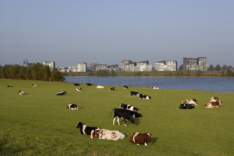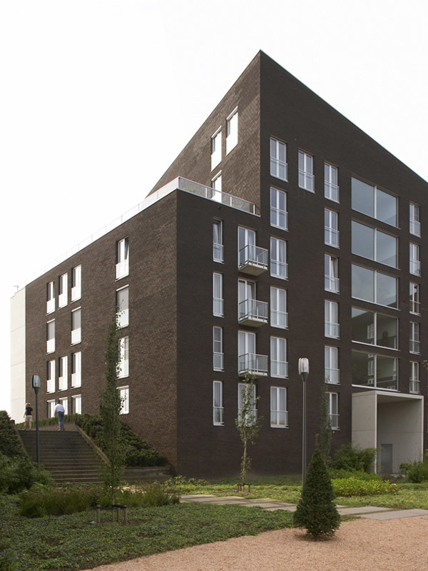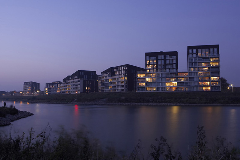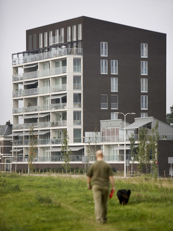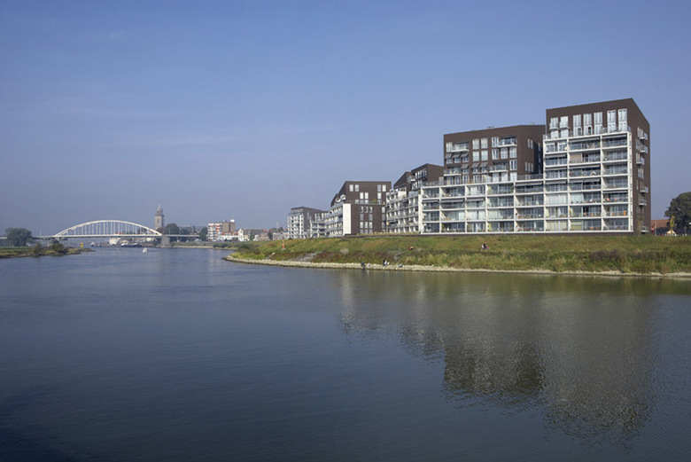 Water has the special force of attraction to stimulate living with a surplus value of a consoling and attractive panorama. Worldwide it is a magnet and connection loop for looks of enjoyment and living pleasure. As an extension to the historical city of Deventer and image to the river, nine blocks of luxury apartments were scattered like dice along the bank of the IJssel. They were connected to each other like couples with large concrete terrace frames and strategically planned with views through to the water. An underground car parking garage slides like a carrier or communal denominator in the bank like a dike for this residence. With rising heights further away from the centre the sloping roof spaces form an interactive game of directions and positions like a nonchalant flirt with the city.