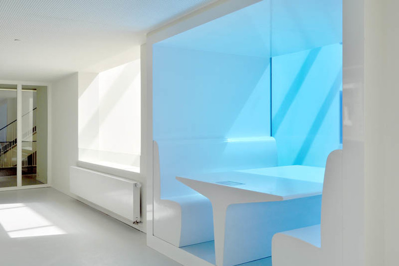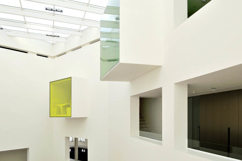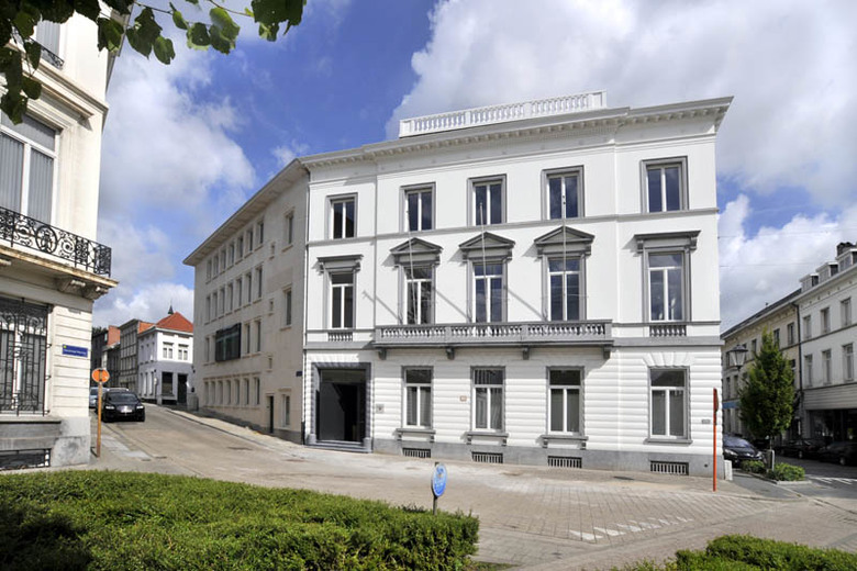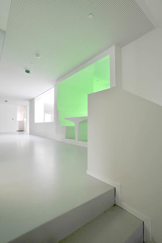 The transformation of the former tax office into a marketing agency. The building is situated at the Kardinaal Mercier square, along the important axis between the Central Station and the old market. The interior area was completely demolished and covered with a glass roof. A new auditorium will be built on the ground floor and cellar level. A monumental staircase leads from the entrance hall to the roof of the auditorium, which gives access to the surrounding offices. Inside, one finds a new, fresh and open interior. Large coloured glass panels are integrated at various locations along the facades.