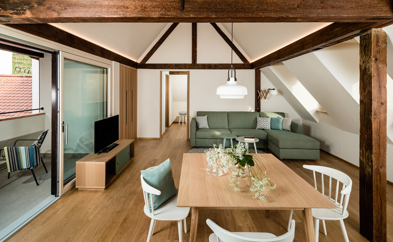 Umbau des Dachgeschosses und Neuplanung weiterer Ferienwohnungen für das historische Residence in Meran (Südtirol).