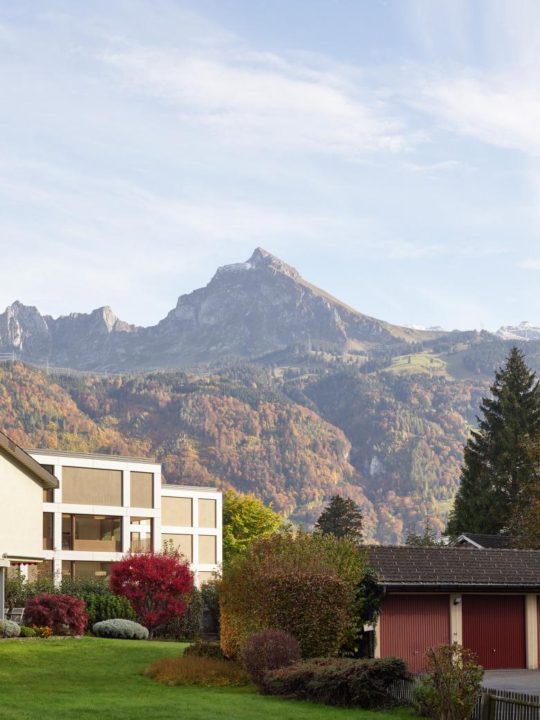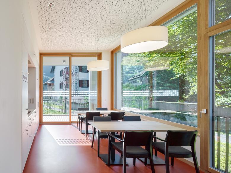 Die Erschliessung bildet das kommunikative und funktionale Rückgrat der gesamten Anlage. Korridore sind keine reinen Verkehrsflächen, sondern schaffen durch das Angebot von Sitzecken und Aussenbe-zügen eine Atmosphäre, die einladend wirkt und Begegnungen fördert. Die Pflegegeschosse sind durch eine wohnliche Intimität mit vielfältigen Aussen- und Innenbezügen und viel Tageslicht geprägt. Rundläufe mit Aufent- haltsnischen laden zum Verweilen und zu sozialen Kon- takten ein und fördern das selbständige Gestalten des Alltags. Die Zimmer sind alle zum Garten ausgerichtet und geniessen die atemberaubende Aussicht.