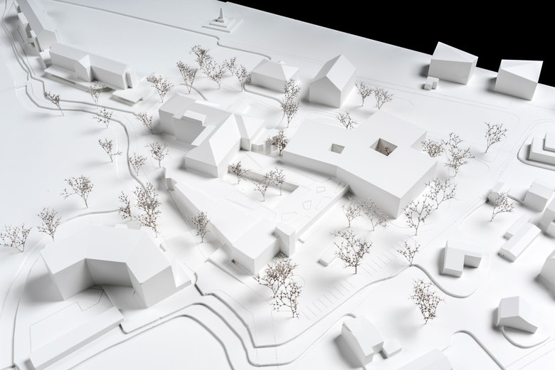 Ausgehend von der Lektüre des Ortes und den betrie- blichen Anforderungen werden die Bestandsbauten und der Neubau zu einem symbiotischen Ensemble vernetzt, das Synergien schafft. Die öffentlichen Nutzungen sind in einem Sockelbau organisiert, der zum Bestand ver- mittelt, während die Pflegegeschosse als kompaktes Volumen in Richtung Landschaftsraum angeordnet sind.