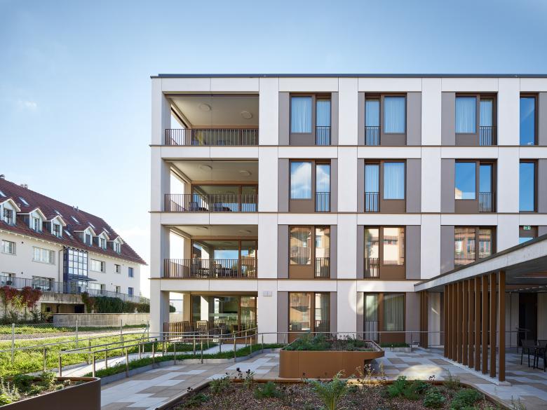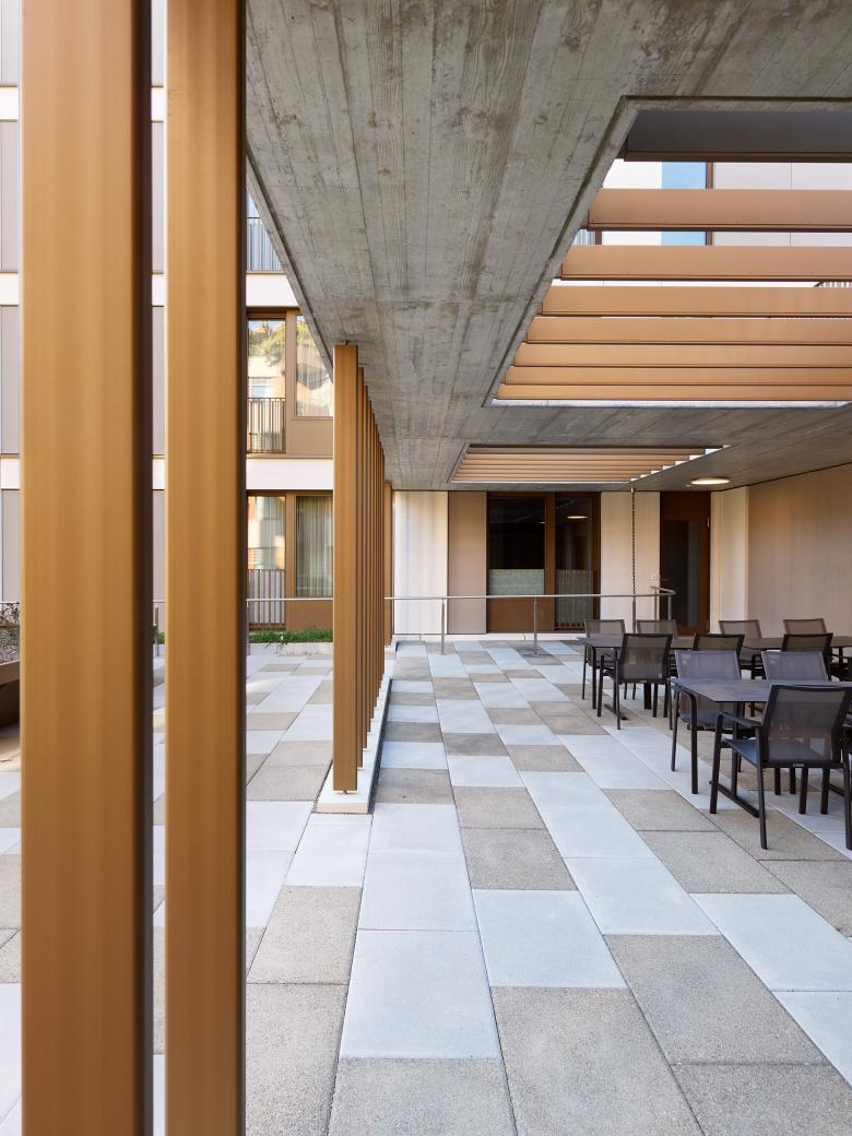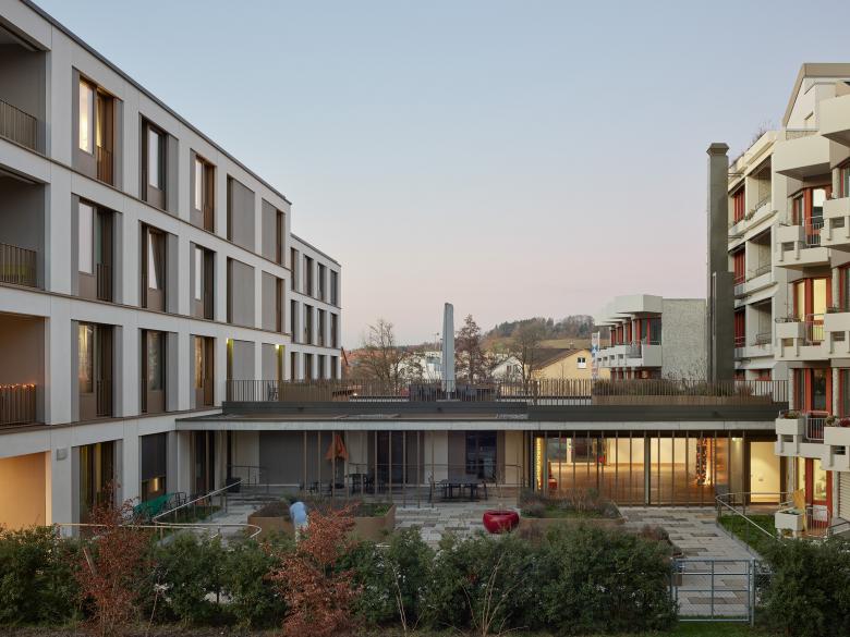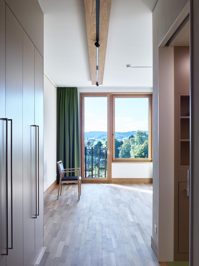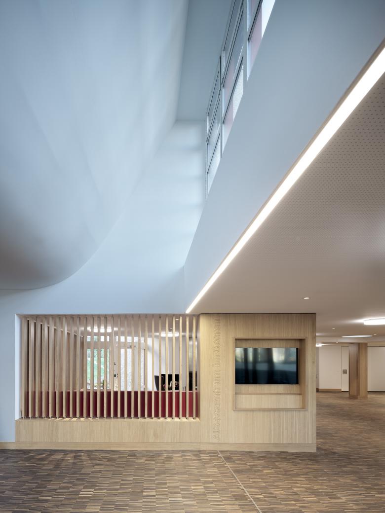 Im Innern werden die Bestandes- und Erweiterungsbauten durch übersichtliche Raumfolgen miteinander vernetzt. Das Erdgeschoss präsentiert sich als öffentliche Zone mit attraktiver Vorfahrt, zentralem Empfang, grosser Durchlässigkeit Richtung Aussenraum und einfacher Wegführung zu den unterschiedlichen Häusern. Die neuen Pflegegeschosse werden durch eine wohnliche Intimität mit vielfältigen Aussen- und Innenbezügen und viel Tageslicht geprägt.