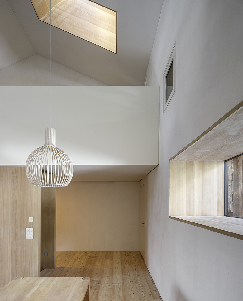Im Innern wurde die Scheune als „Haus im Haus – Prinzip“ mit vorfabrizierten Holzrahmen-Elementen ausgebaut. Der überhohe Wohnraum schafft eine unerwartete räumliche Grosszügigkeit. Die kompositorisch angeordneten Fenster bieten hierbei unterschiedliche Lichtstimmungen und präzise Ausblicke in die Umgebung.