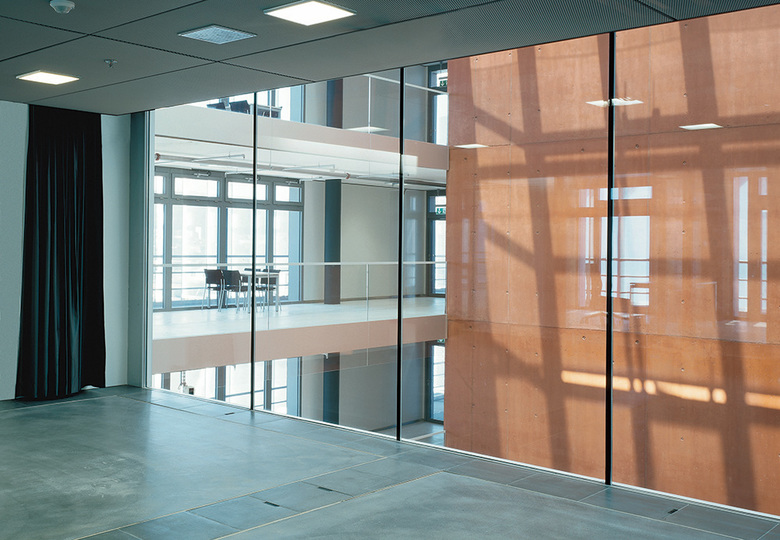 Die Räume der unterschiedlichen Nutzungszonen gruppieren sich um das 5-geschossige Atrium, das durch die schwebenden Sitzungsboxen, den Treppenaufgang und die Sichtbeziehungen zum räumlichen Erlebnis wird. Die flexibel nutzbaren Räume an der Aussenfassade ermöglichen neue Arbeitsformen mit frei vernetzbaren Arbeitsplätzen. Seminarräume, ein Vortragsaal und Bibliothek sowie ein Personalrestaurant komplettieren das vielfältige Raumangebot.