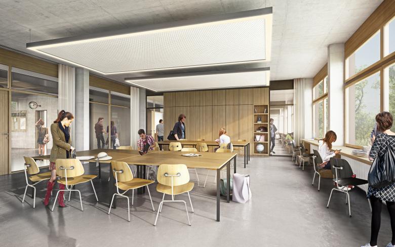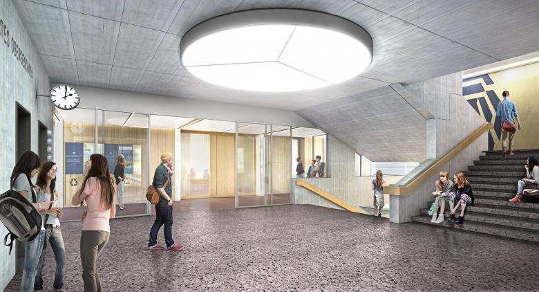 Die starre räumliche Struktur wird durch flexible Füllungen ergänzt und aufgebrochen, so dass anpassbare Klassen- und Arbeitsräume und eine höhere Nutzungsdichte geschaffen werden. Modulare Wandelemente zwischen den einzelnen Klassenräumen und zum Korridor erhöhen die räumlichen Qualitäten im gesamten Klassentrakt. Transparente und schaltbare Räume beidseitig der Treppenanlage schaffen eine Lehr- und Lernumgebung, die sich an die jeweiligen Lernbedürfnisse anpassen lässt und stellen eine bessere Belichtung der Erschliessungsbereiche und Orientierung im Gebäude sicher.