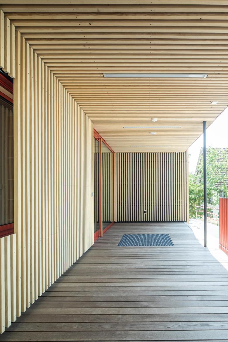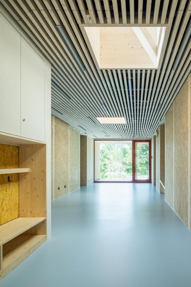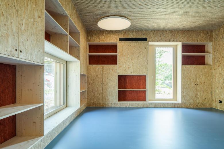 Die Aufteilung des Grundrisses in einen flexiblen und als Rundlauf organisierten Gemeinschaftsbereich sowie drei abgeschlossene Raumzonen (Spielen, Schlafen, Büro) ermöglichen es, individuell auf die unterschiedlichen Bedürfnisse der Kinder im Tagesverlauf reagieren zu können. Die möblierten Fassaden bilden von innen Fenster- und Sitznischen aus, die von den Kindern spielerisch entdeckt und genutzt werden können.