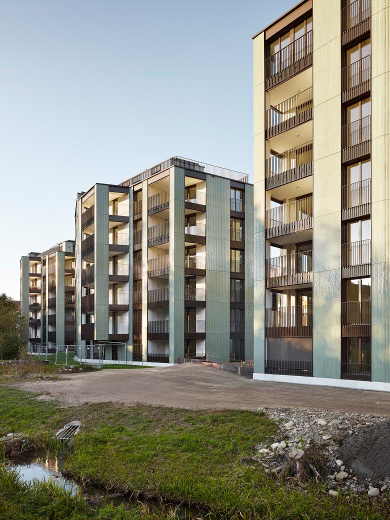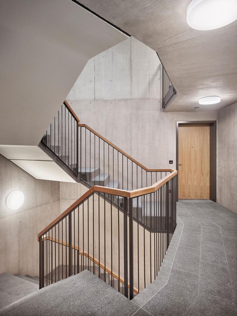 Die 1.5 bis 5.5-Zimmer-Wohnungen sind alle von gleichwertiger Qualität und profitieren von der direkten Sicht Richtung Katzenbach. Das statische und haustechnische System ermöglicht flexibel einteilbare Geschosse. Trotz der unregelmässigen Gebäudeform zeichnen sich die Grundrisse durch einen grossen Wiederholungsfaktor und modulare Wohnungstypen aus. Die Systemtrennung ist konsequent umgesetzt und das Projekt insgesamt 2000-Watt-kompatibel.