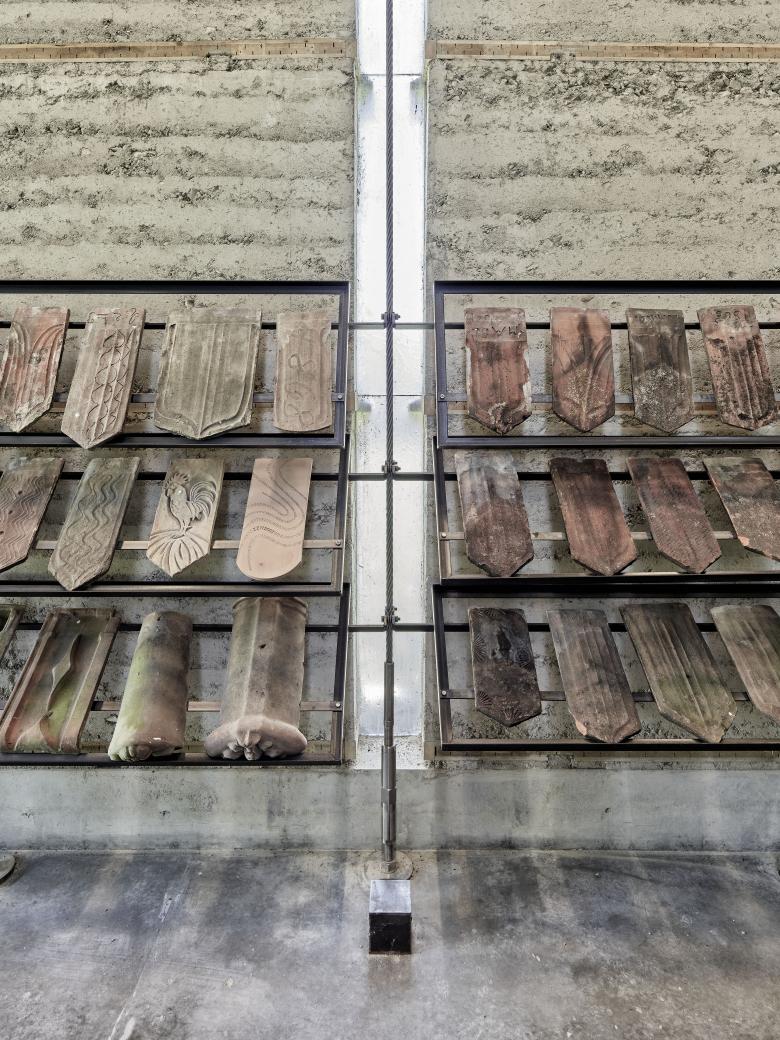 Der Ausstellungsraum mit anschliessendem Ofen hat eine massive, aussteifende Holzdecke. Sein Charakter wird durch die Präsenz des Lehms und die Monumentalität der abschliessenden Ofenwand geprägt. Durch die Lichtschlitze der offenen Fugen, vor denen die Vorspannung verläuft, wird die ganze Massivität der Lehmwände erlebbar, die in Kontrast zur Filigranität der Zugstäbe steht. An diese können einfache Stahlrahmen geklemmt werden, die Ausstellungspaneele oder Exponate halten. Eine Wendeltreppe aus Stahl erschliesst die Aussichtsplattform auf dem Dach.
