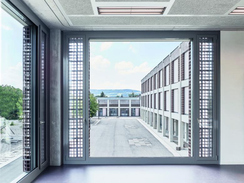 Passiv-bauliche Massnahmen zeichnen die Nachhaltigkeit der Bauten aus. Der Schultrakt wie auch die Sporthalle sind als Skelettbau mit vorfabrizierten Betonstützen ausgebildet. Die Adaptierbarkeit der Räume durch Faltwände und die Bauweise mit Leichtbauwänden ermöglichen langfristig eine Anpassbarkeit an wechselnde Bedürfnisse. Lehmputzwände regulieren die Feuchtigkeit und verbessern so das Raumklima. Das Kalkmaterial der Putzfassade wurde regional gewonnen und besteht ausschliesslich aus natürlichen Zuschlagstoffen. Aussen wie innen gibt es unterschiedliche Terracotta-Elemente. Jene der Lüftungsgitter wurden so entwickelt, dass die geforderten Lüftungsquerschnitte erreicht werden. Sie erlauben in den Klassenzimmern eine witterungsunabhängige Lüftung und eine Nachtauskühlung, sodass auf eine Lüftungsanlage verzichtet werden konnte. Ähnliche Steine wurden im Innern als Akustikelemente verwendet. Im Rahmen eines Kunst-am-Bau-Projekts wurden Mosaike entwickelt, die als Intarsien in die Böden eingearbeitet sind. Diese von Natursteinmosaiken aus Italien inspirierte Arbeit war finanzierbar, weil die Steine heute maschinell in ihre Form geschnitten werden können. Die neu entwickelten Leuchten in den Foyers und Treppenhäusern haben handgeformte Gläser, die in der Nähe von Murano gefertigt wurden. Durch ihre Einschlüsse und ihre unregelmässige Oberfläche bringen sie das Licht der industriell gefertigten LED-Lampen zu einer stimmungsvollen Wirkung.