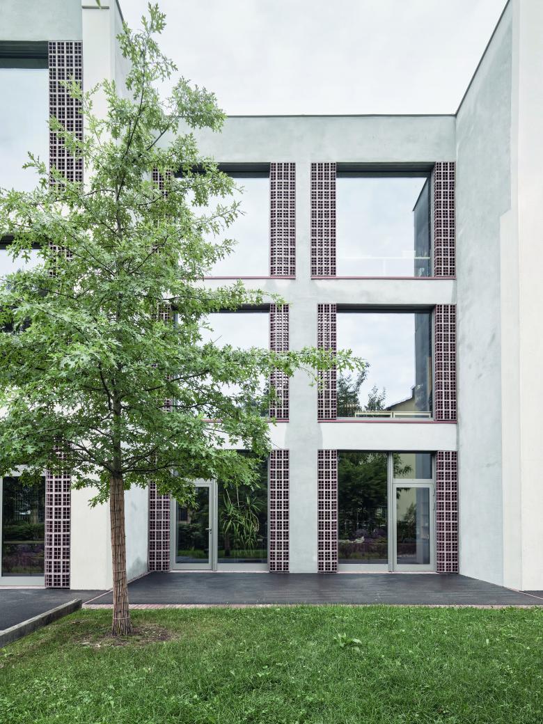 Das bestehende Ensemble der Sekundarschule Krämeracker wird durch die Schulneubauten und die neu geforderten Aussenräume erweitert. Das längliche Schulgebäude liegt parallel zum Sekundarschulhaus und empfängt die Schüler mit einem Kopfbau. Die Sporthalle liegt den bestehenden Turnhallen gegenüber, sodass durch die schachbrettartige Ordnung unterschiedliche Aussenräume entstehen. Die Neubauten bleiben niedrig. Mit feinen vertikalen und horizontalen Volumenversprüngen werden räumliche Beziehungen zum benachbarten Schulgebäude und zum Wohnquartier etabliert.