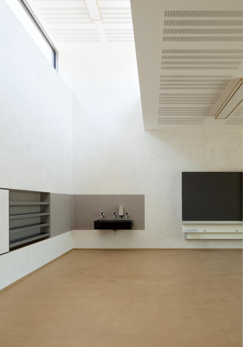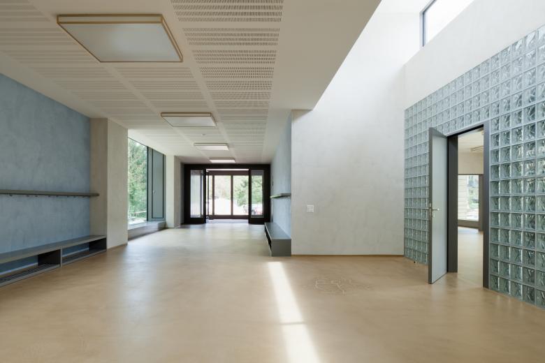 Im Innern aktivieren unterschiedlich tiefe Nischen die Querrichtung des langen Erschliessungsraums, gemeinsam mit den, durch Licht von oben akzentuierten, gegenüberliegenden Vorzonen der Hort- und Schulräume. Da die Rhythmen der beiden Längswände nicht kongruent sind, werden die räumlichen Zuordnungen komplex, sodass aus dem Korridor eine Halle wird. Einem Rückgrat gleich sitzt das Oberlicht längs über dem Gebäude. Es verbindet die Eingangshalle mit den Zimmern, indem die Mittelwand mäandriert, sodass das Licht abwechselnd in beide Bereiche fällt. Die Zimmer erhalten durch die helle Nische, die so entsteht, einen starken Rückhalt. Primär sind die Räume auf die Loggia und den Garten hin ausgerichtet. Auch hier sind die mächtigen Fenster räumlich ausgebildet und definieren mit einer kräftigen Schwelle eine eindeutige Grenze zum Aussenraum. Mittels Schiebetüren lassen sich die Horträume zu einer weiträumigen Enfilade verbinden, die über weitere Türen bis auf die ganze Gebäudelänge vergrössert werden kann. So findet der Raum der Loggia im Inneren ein Echo und die Orientierung der Zimmer zwischen Rückwand und Garten einen Kontrapunkt. Die Rhythmen von Raumteilung und Fassade sind auch hier nicht kongruent.