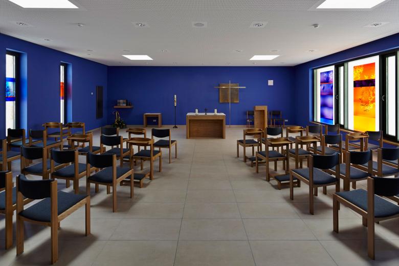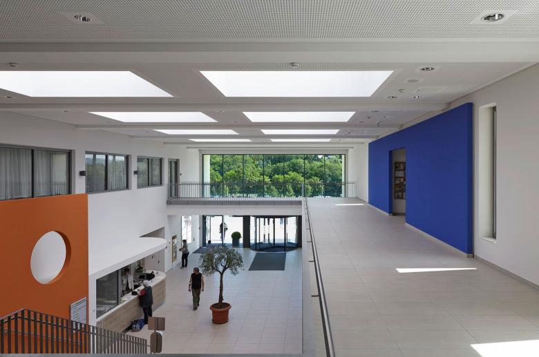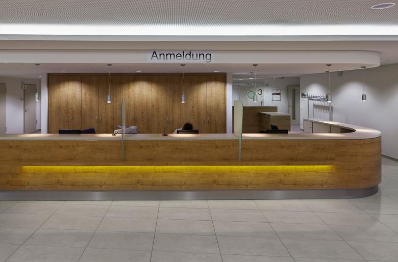 Nach Abriss der vorgelagerten Rampen und Umplanung hat das St. Ansgar Krankenhaus nun eine völlig neue Erschließung auf der heutigen Erdgeschoßebene bekommen. Hier gelangt der Besucher in einen großzügigen Eingangsbereich mit Cafeteria und Konferenzräumen auf der einen Seite sowie einer Zentralambulanz mit Liegendanfahrt auf der anderen Seite. In der oberen Ebene ist die Kapelle neu angeordnet und künstlerisch gestaltet. Eine helle Gestaltung mit Akzentfarben schafft innen wie außen eine angenehme Atmosphäre.