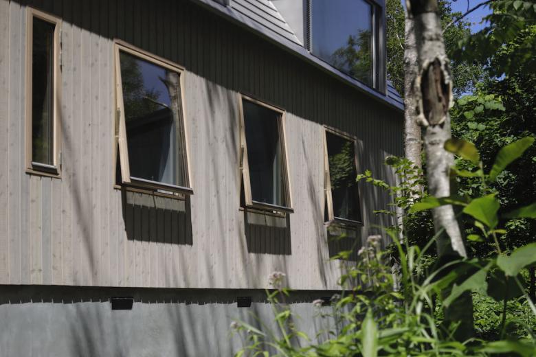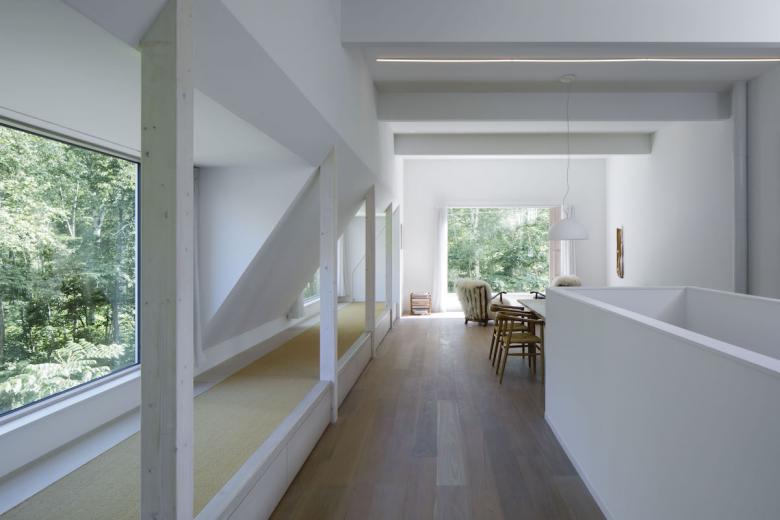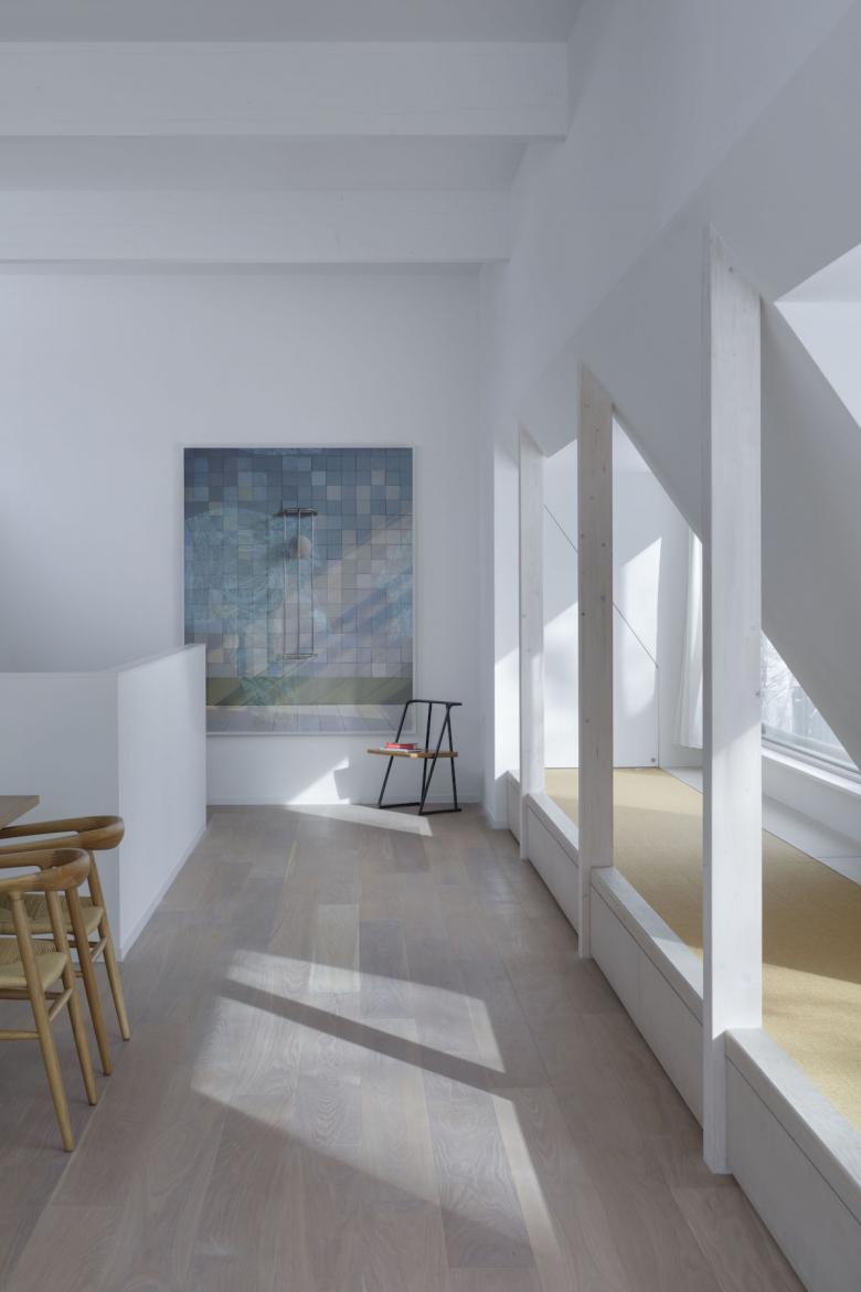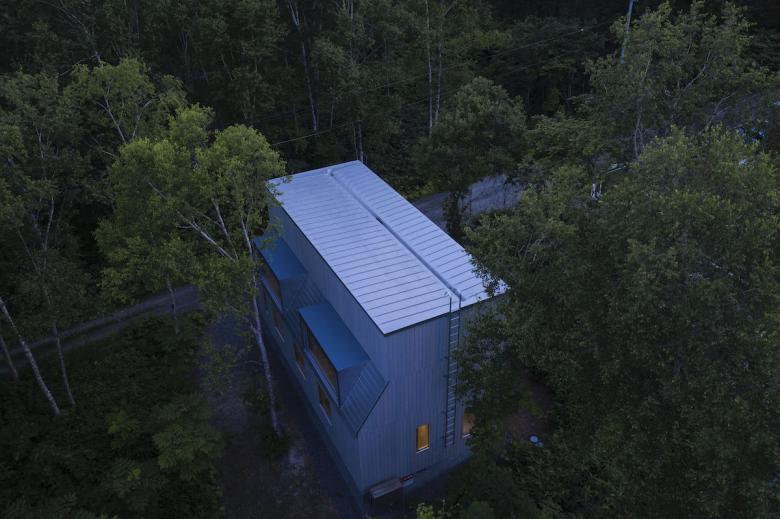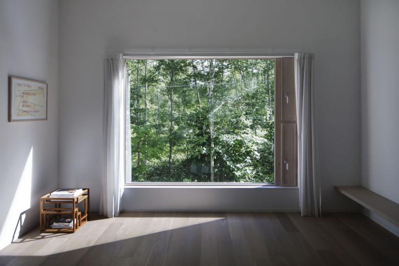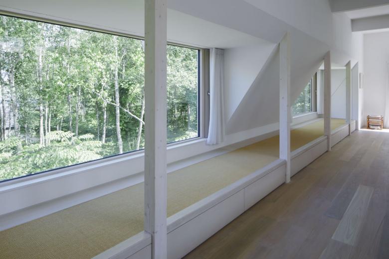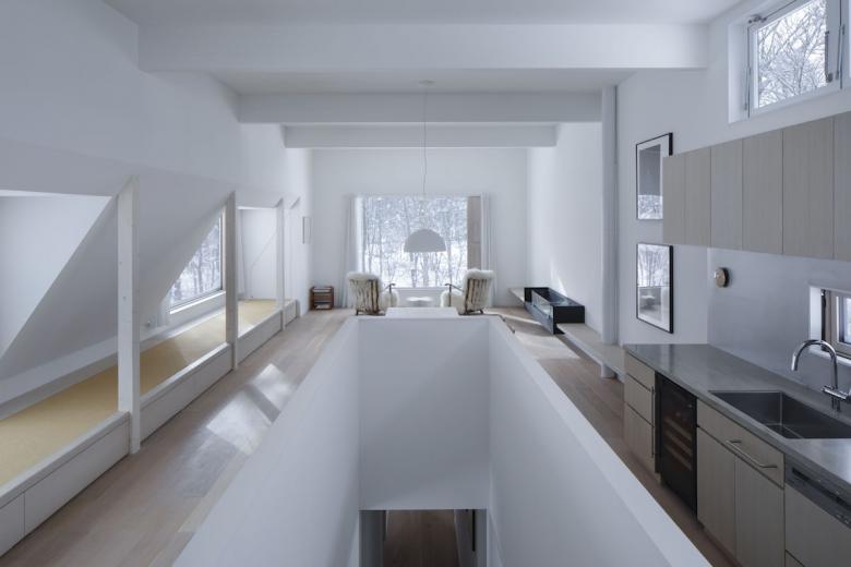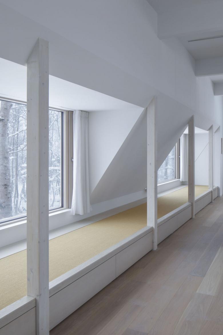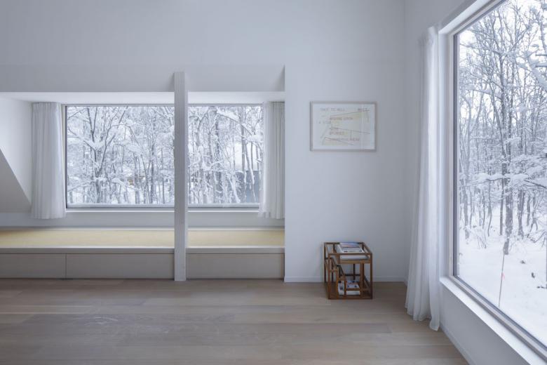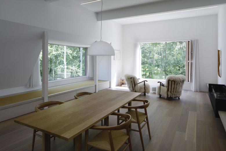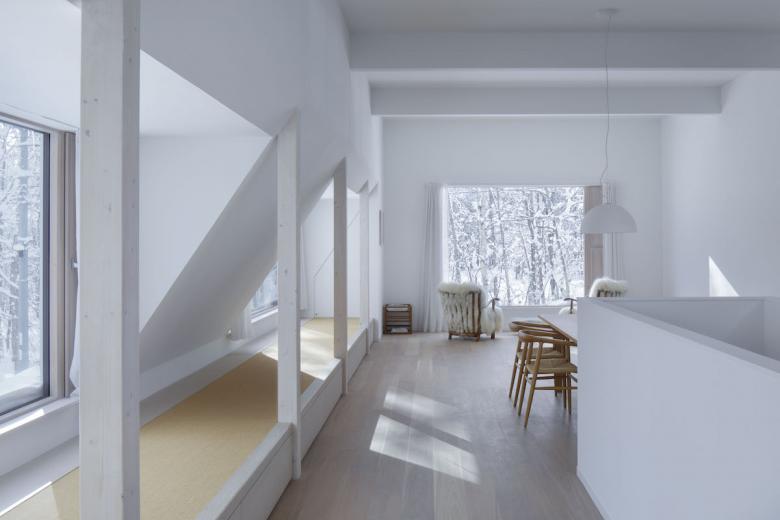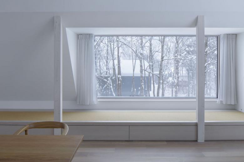 As a result, we were able to create a distinctive interior space that incorporates the sloped surface which serves as the roof outdoors, as well as the ceiling and walls indoors. Two large, deep windows were installed in the sloped area. From here, Mt. Yotei can be seen. In addition to the two large bay windows, a small zashiki seating was designed in one repeating sequence. This allowed us to create a calm space without disturbing the openness of the entire second floor, which serves as the living and dining area.The owner is also an art collector, thus the walls and ceilings were finished in white, and the flooring and fixtures in a saturated color scheme to create a contrast with the view from the windows and the artworks installed. The exterior walls were made of local cedar stained in light gray, and the roof was made of silver-colored steel sheets. Here we aimed to create an architecture that can blend into the snowy landscape of the white birches.