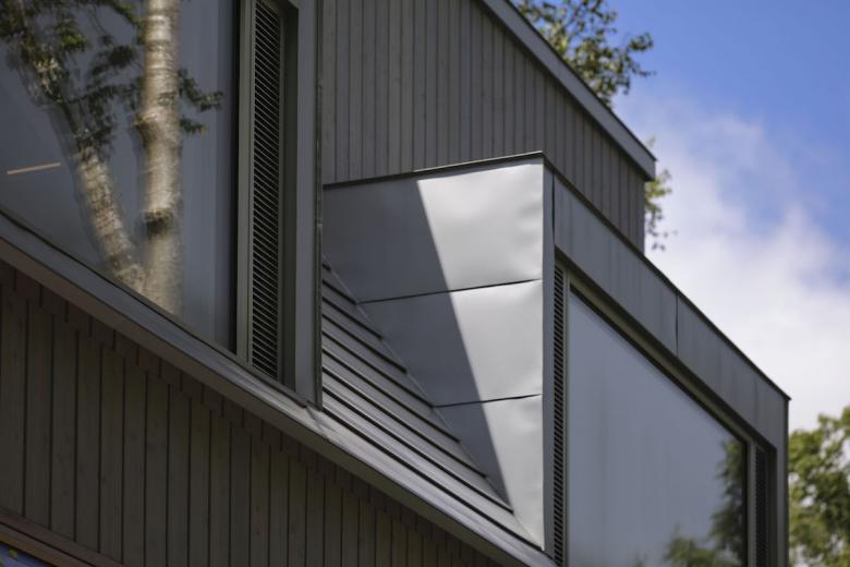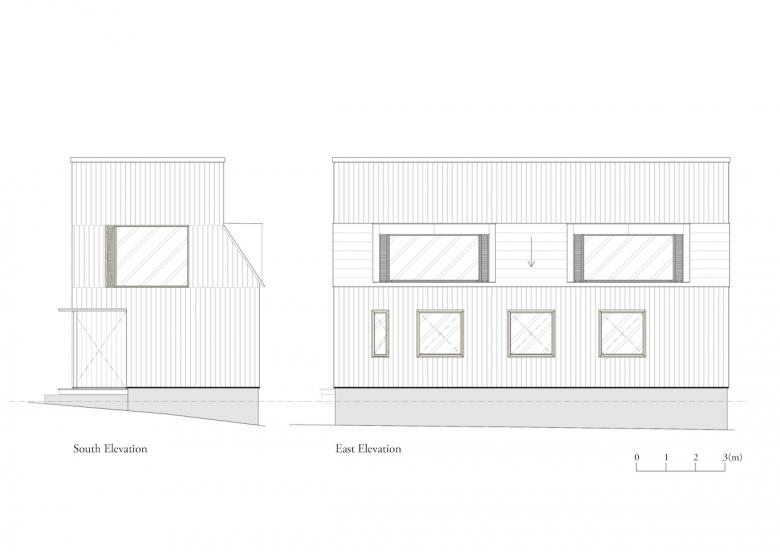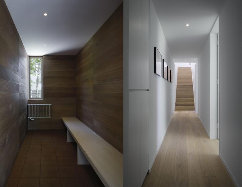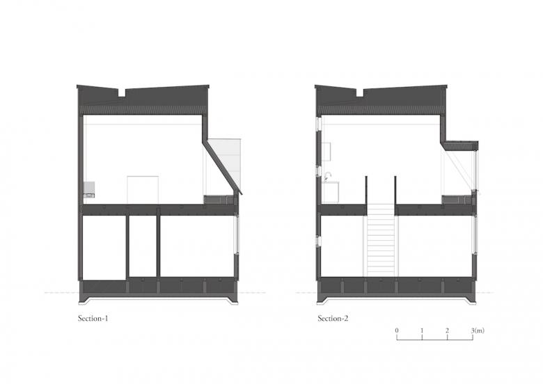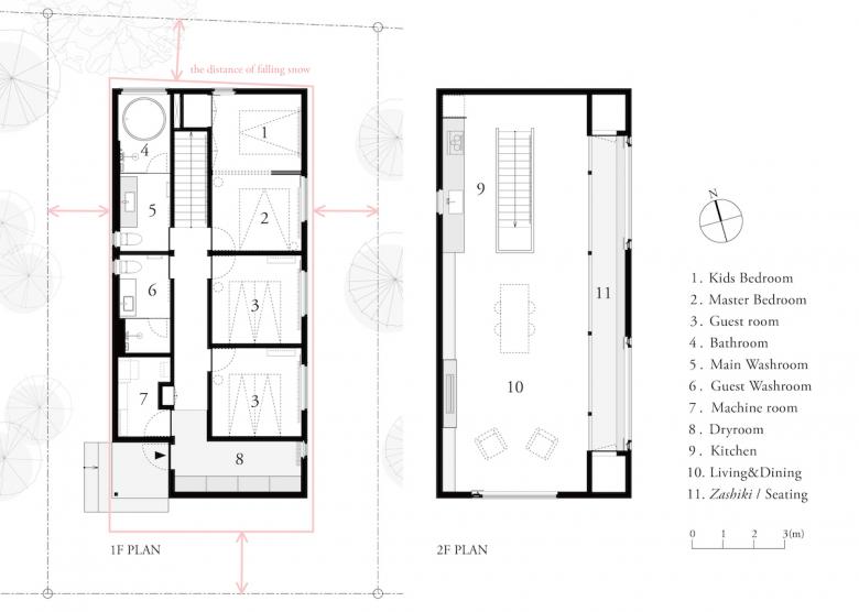 The first issue in the planning process was the form, the volume of the building. The area is one of the heaviest snowfall areas in Hokkaido, and we had to comply strictly with the regulations on the distance of falling snow (the distance from the neighboring land that must be secured based on the slope and height of the roof). However, the site had a short side of 10 meters, meaning that the width of the volume would be very small if the building was to have a gabled roof like a chalet, and in turn, only a narrow building with a low ceiling would be possible. On the other hand, the client wanted a form that was not monotonous and box shaped. Therefore, we decided to create a volume that minimizes the distance of falling snow while securing the floor area and ceiling height as much as possible by incorporating a moderate combination of flat and sloped roofs.