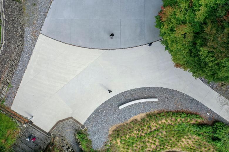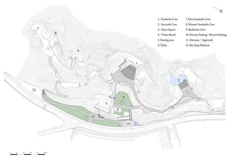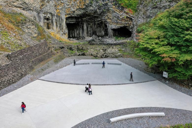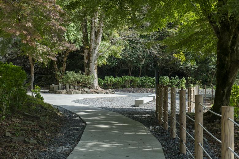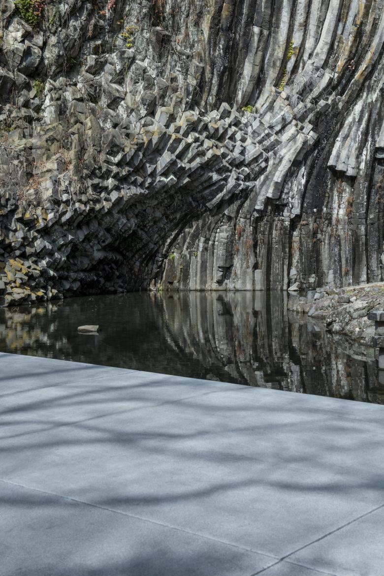 The core of this maintenance was the creation of large concrete “stages” in front of the ”Genbu-do” and ”Seiryu-do” caves, which have particularly large columnar joints. Benches were placed in front of each stage, creating a place where visitors can confront nature as if they were looking up at the cave in front of them. In addition, the surfaces of the platforms and benches were sandblasted to give them a rough surface, creating a finish that is compatible with nature even though they are made of concrete. The same materials and finishes were used for the park paths throughout the park, and curved and linear lines were used to create a contrast with the organic lines of nature.