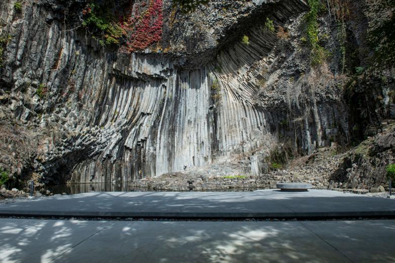 The rough rock surface has a large wavy pattern with countless ripples. A hard wall can be seen with hexagonal rock cross-sections in layers. “Genbu-do Park” in Toyooka City, located on the west side of Hyogo Prefecture, is a nature park where visitors can see the characteristic geological features called “columnar joints” that developed roughly 1.6 million years ago when the magma cooled and solidified. This project was a redevelopment plan for this park, which has been a scenic spot for many years, in conjunction with the transition to charging admission for visitors. The most discussed issue throughout the planning process was how to enable visitors to experience the power of the columnar joints, also known as “nature’s sculptures”. Another issue was the balance between the degree to which existing elements of the park should be retained and new elements should be added.