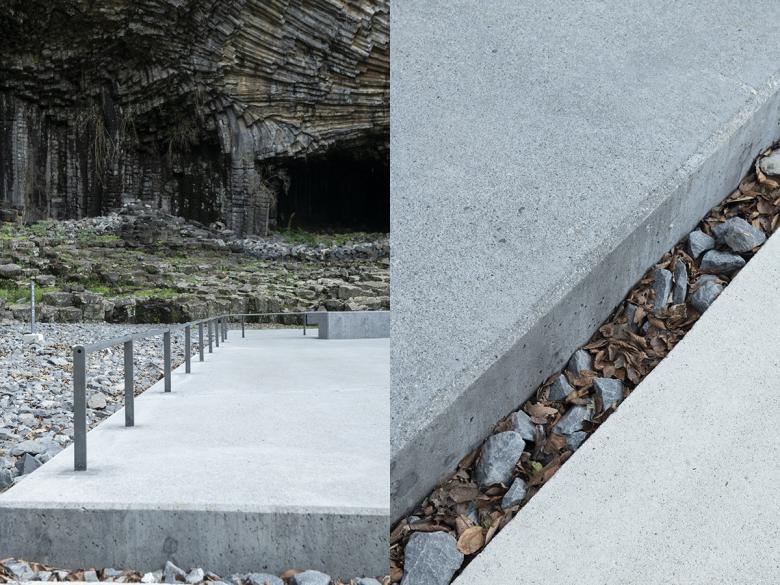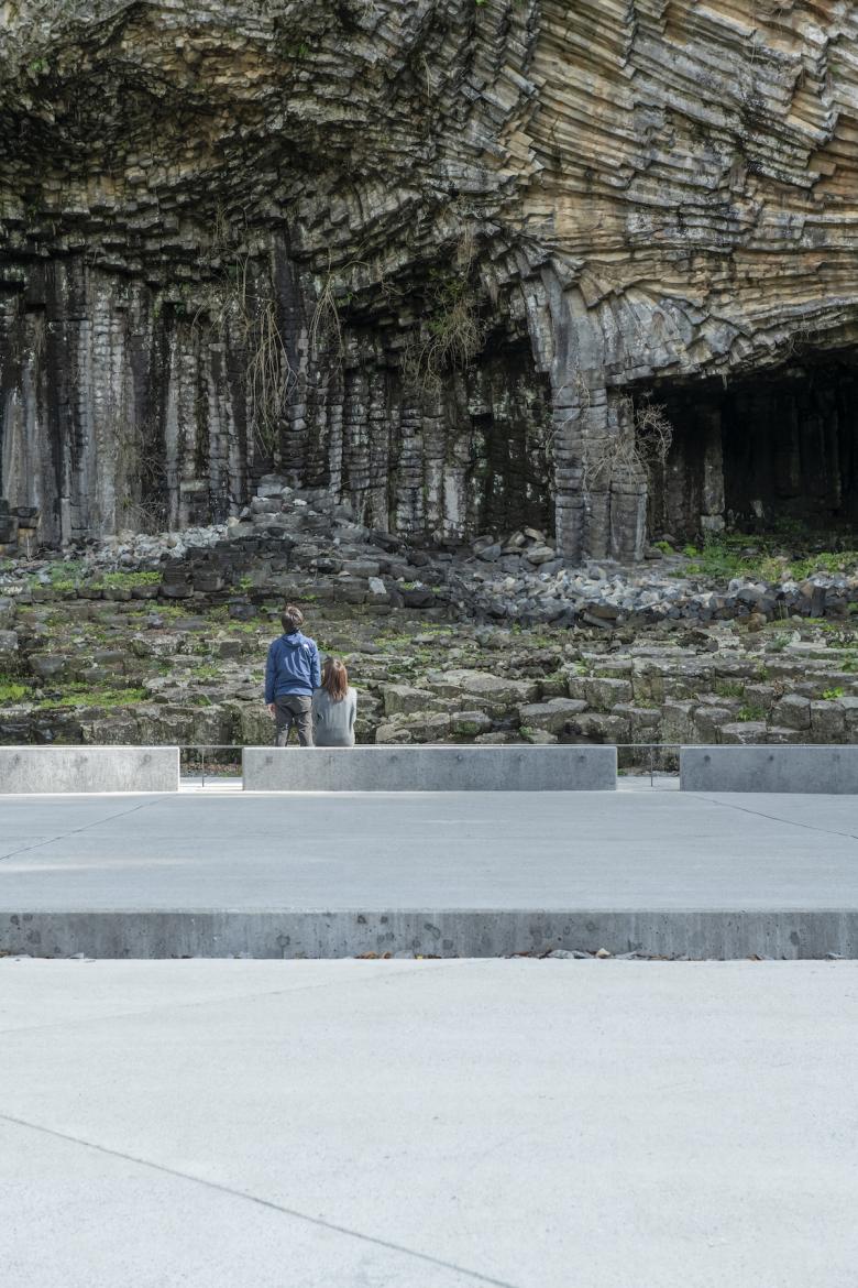 Behind the development of these improvements were several issues that have been identified within the existing park. The first was the issue of color, which stands out to the viewer when viewing the caves. Some of the existing paved surfaces were maintained in a yellowish tone, which, although gentle in color, created a brutal visual impression for viewing nature. Another challenge were the original fences installed to prevent visitors from entering the various caves. Given the danger of falling rocks in some areas of the park, the fences were installed to control entry, but while ensuring the safety of park visitors, they also created a visual obstacle to appreciate nature. Thus, the new platform was planned to solve these issues. The existing fence, which was considered problematic, was removed, and replaced with steel bars were installed where necessary, integrated with the stage, minimizing its presence as much as possible. By reviewing the colors, materials, and forms of the structures, the spatial separation between the caves and the viewers was reduced, allowing the viewers to experience the power of nature as it is.