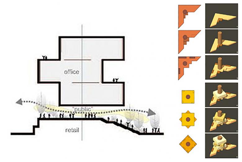 This site for a local commercial centre was to form the first of a series of projects that heralded the entry of a prominent builder into that neighborhood. Given this, and the context of a triangular site at the junction of major roads, the architectural proposal for a new mixed use tower consolidates the design program into an iconic configuration. The triangular retail podium houses retail and restaurant spaces, connected to public plazas along the street edge. The upper office tower is divided into segments that twist as they rise, creating a dramatic addition to the neighborhood skyline.