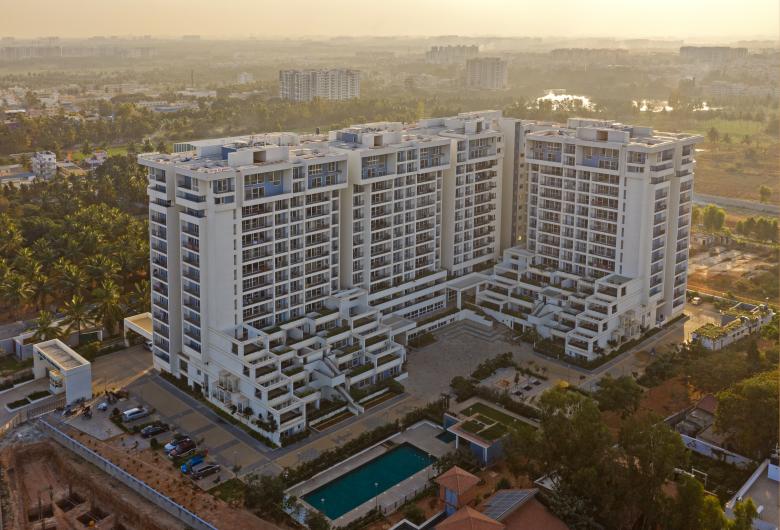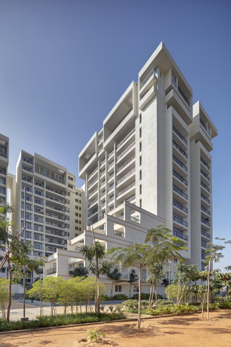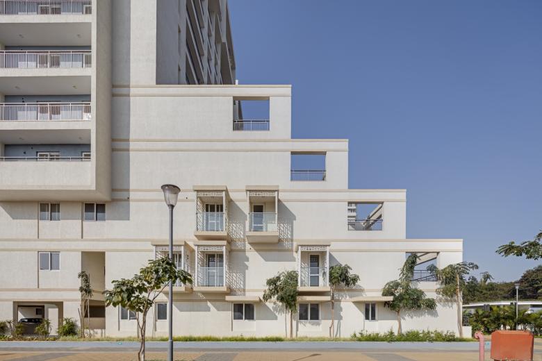 L shape organisation of blocks at masterplan level helps create large public plaza within the site, thoughtfully placed on north side be shaded from harsh sunlight almost throughout the day. The entire north & east side units and terraces overlook into public plaza, buzzing with activities.