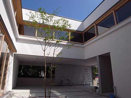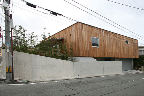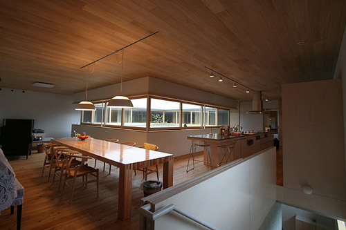 5人の家族のための2層の回廊型住宅で、斜面にあわせてRCの1階に木造の2階がのる。もみじの植わる中庭を囲んで、キッチン、リビング、ライブラリー、子ども部屋が連続した行き止まりのない回廊型のワンルームとなっている。中庭に向かって、木製の建具を全面的に開放することが可能で、風が通り抜け、外部と一体となる。何でもできる巨大なキッチンカウンターや大きなダイニングテーブルが場所の使い方を決めている。