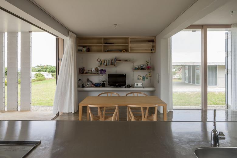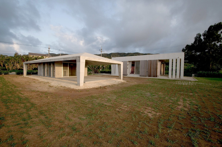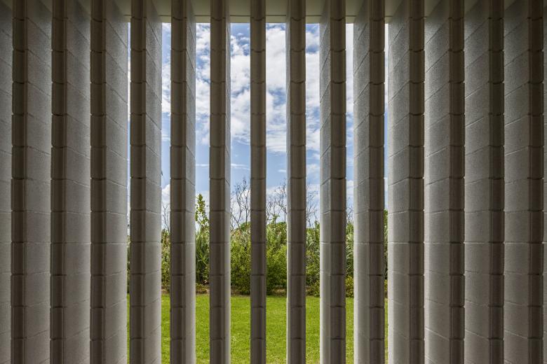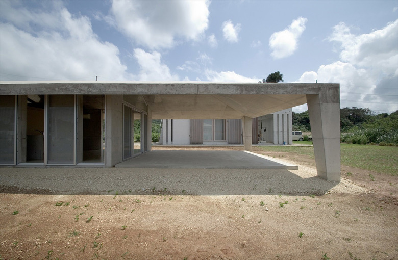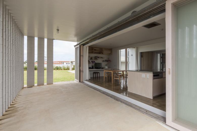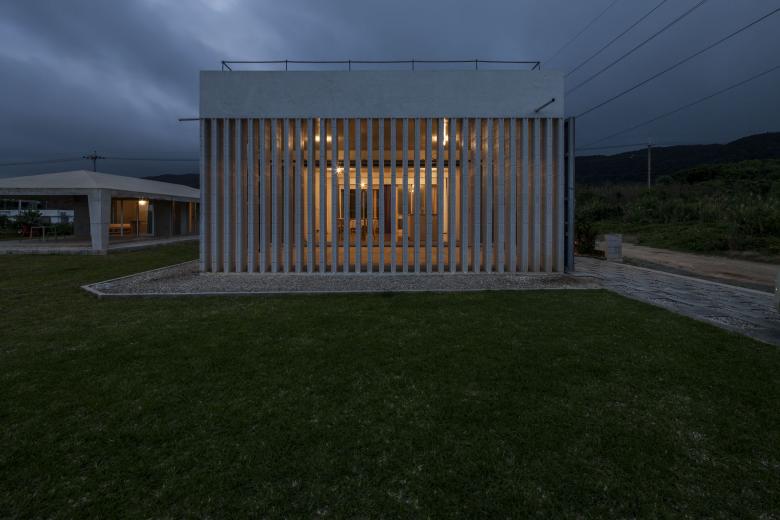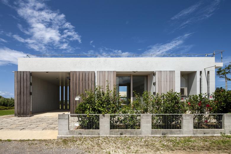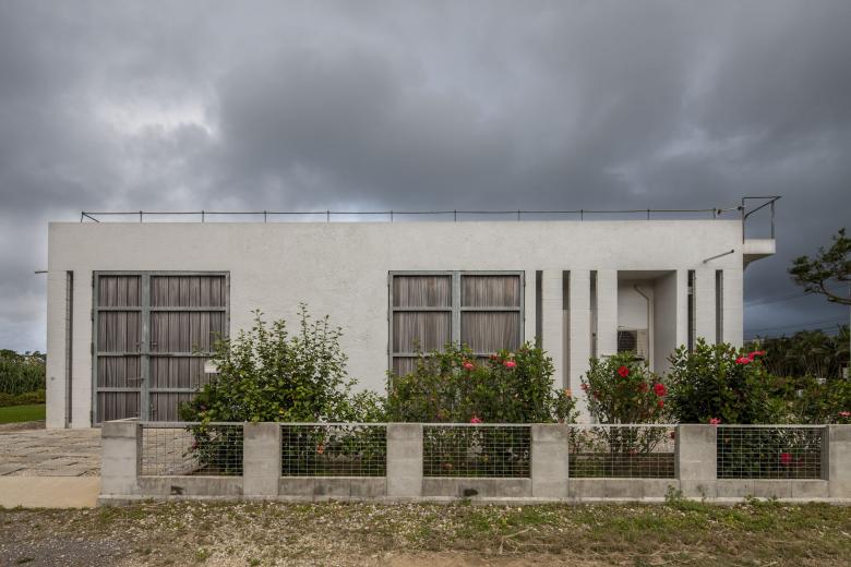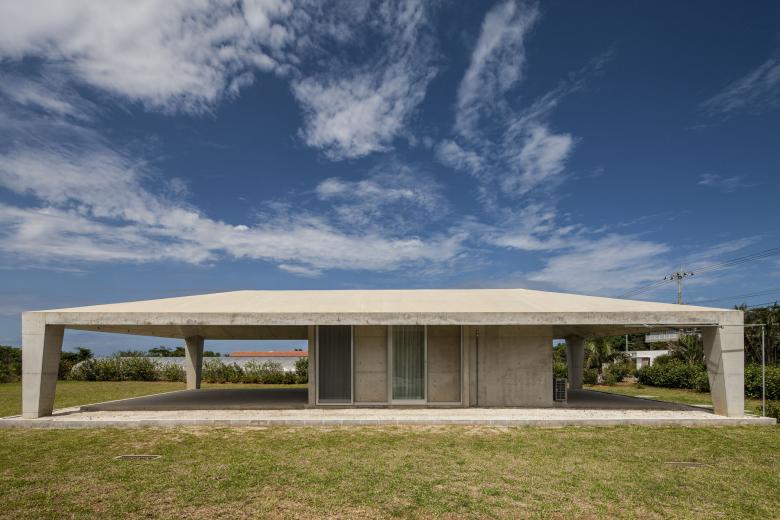 風通しがよく、空調設備に頼らない亜熱帯にふさわしい石垣島に建つ住宅。広大な場所にカジュマルの樹に寄り添うように建つ。外周部に既製コンクリートブロックを一列に列柱のように積んで透かした壁をつくり、毎年訪れる強力な台風(風速60mに及ぶ)を避けて、光と風を取り込み、木陰のような空間をつくりだす。屋根は断熱性を高めるため土砂を盛り、海を眺める緑の庭とした。台風時や家を離れるときは、大きな木の扉を閉めて閉じたハコになる。