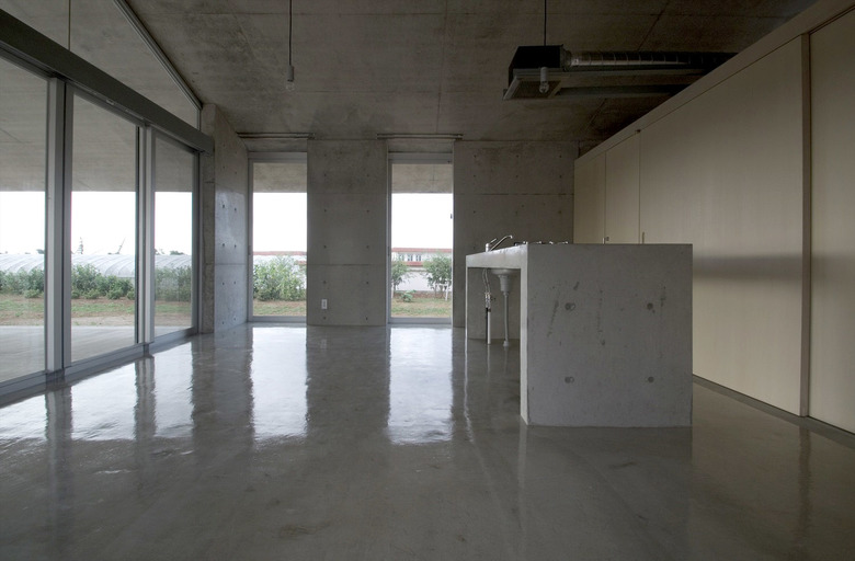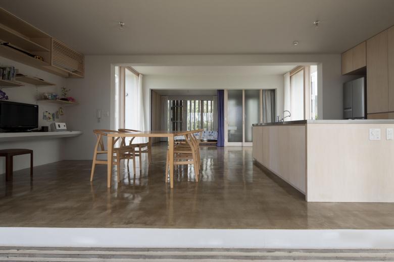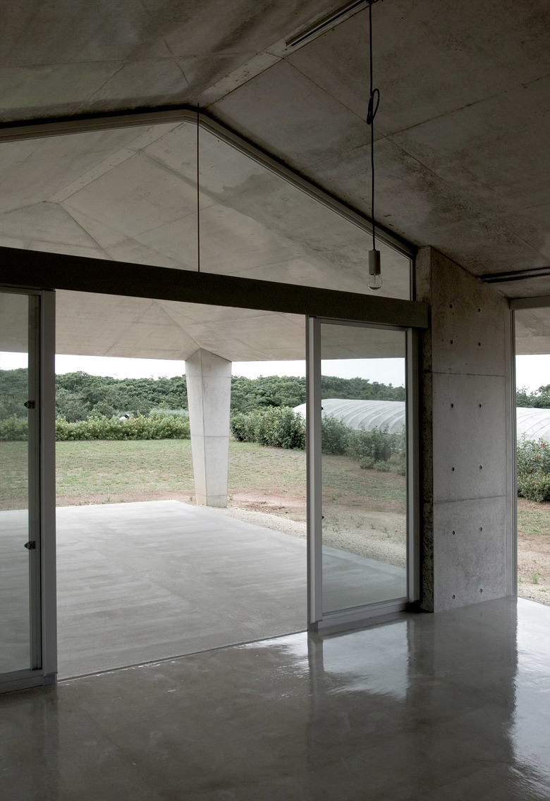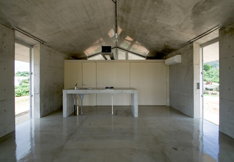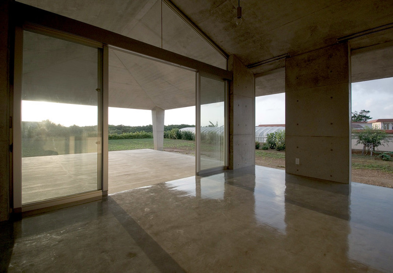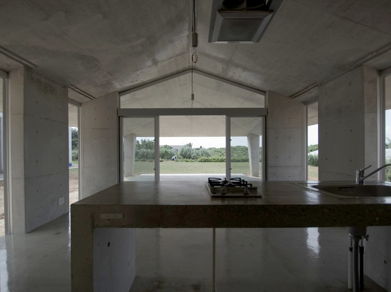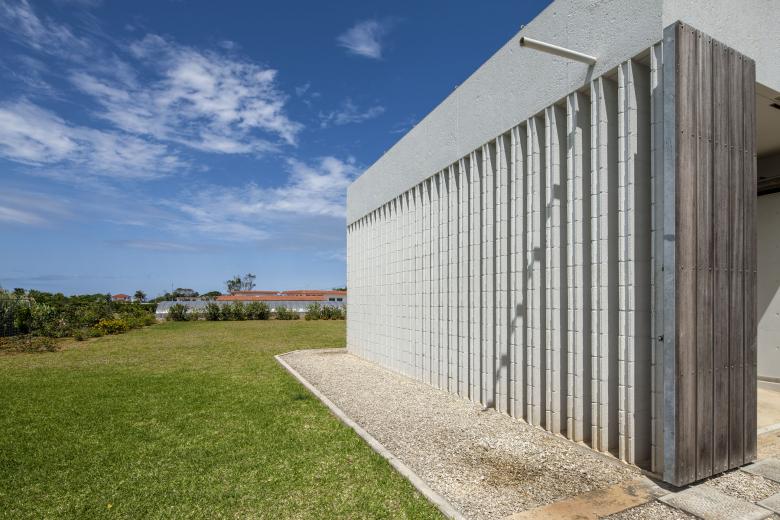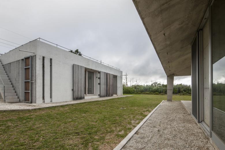 風通しがよく、空調設備に頼らない亜熱帯にふさわしい石垣島に建つ住宅。広大な場所にカジュマルの樹に寄り添うように建つ。外周部に既製コンクリートブロックを一列に列柱のように積んで透かした壁をつくり、毎年訪れる強力な台風(風速60mに及ぶ)を避けて、光と風を取り込み、木陰のような空間をつくりだす。屋根は断熱性を高めるため土砂を盛り、海を眺める緑の庭とした。台風時や家を離れるときは、大きな木の扉を閉めて閉じたハコになる。