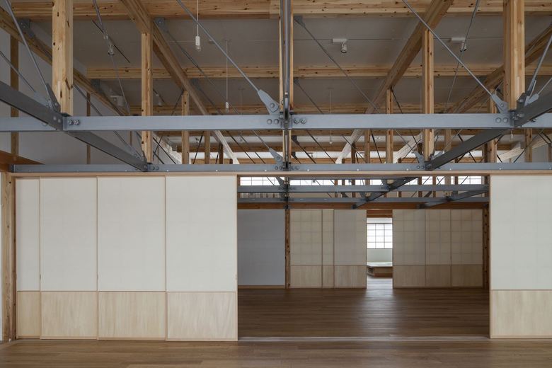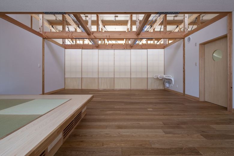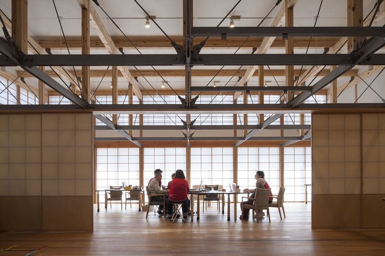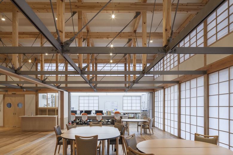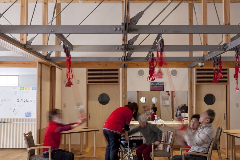 福井でも雪深いエリアに建つ特養に隣接したデイサービス。約12m×12mの無柱空間は広場のような場所で、現代の民家といった趣の木と鉄のハイブリット構造による大きな空間は冬でも暖かく明るく、気持ちが良い。高齢者の活動以外にも、放課後の子どもたちの居場所、地域の催しにも使える、高齢化した集落の寄合所を目指しています。