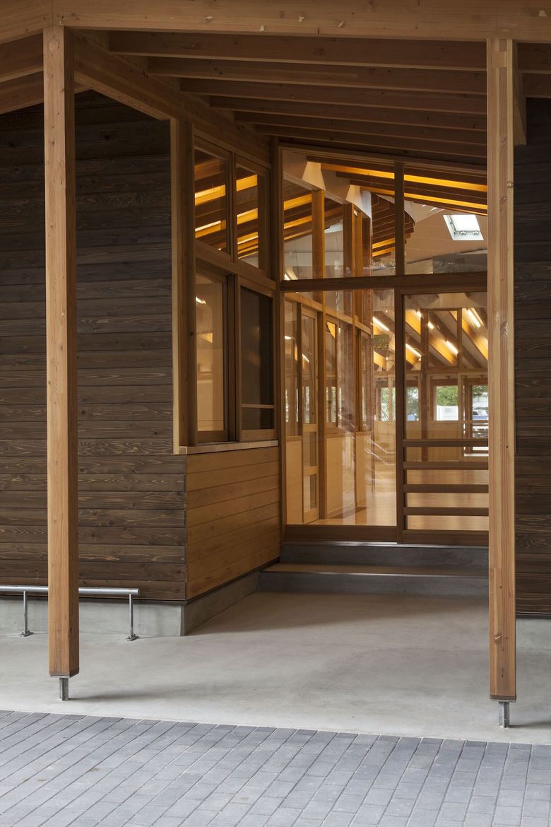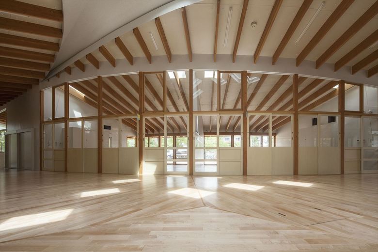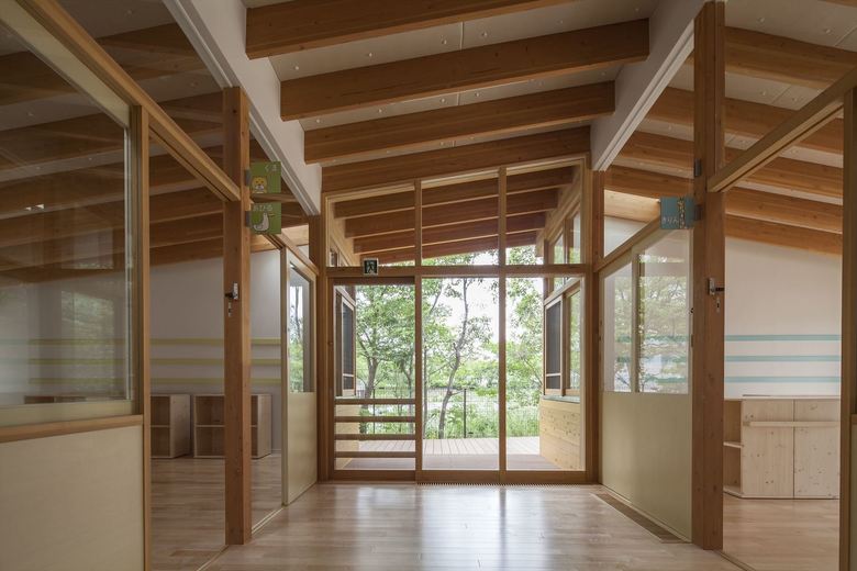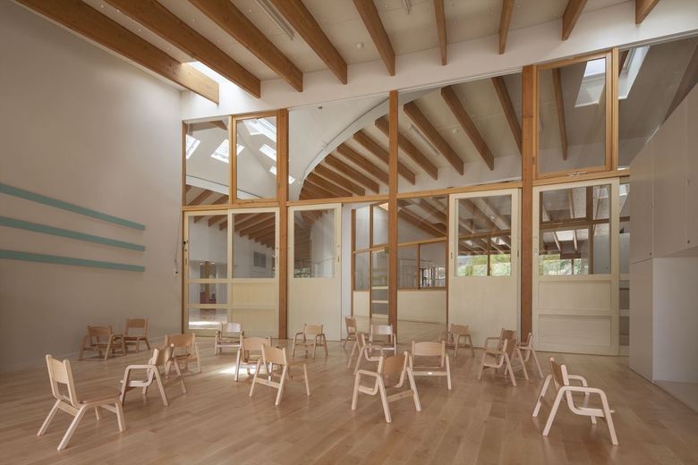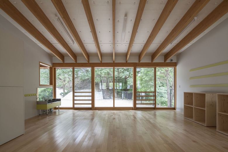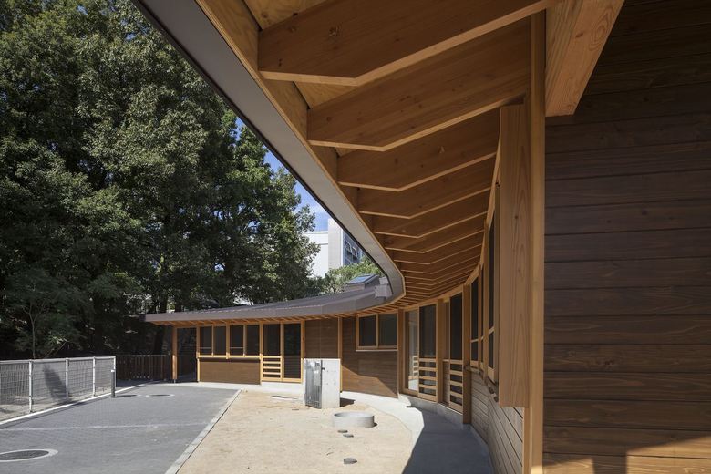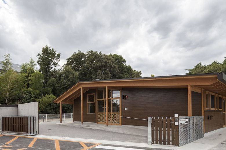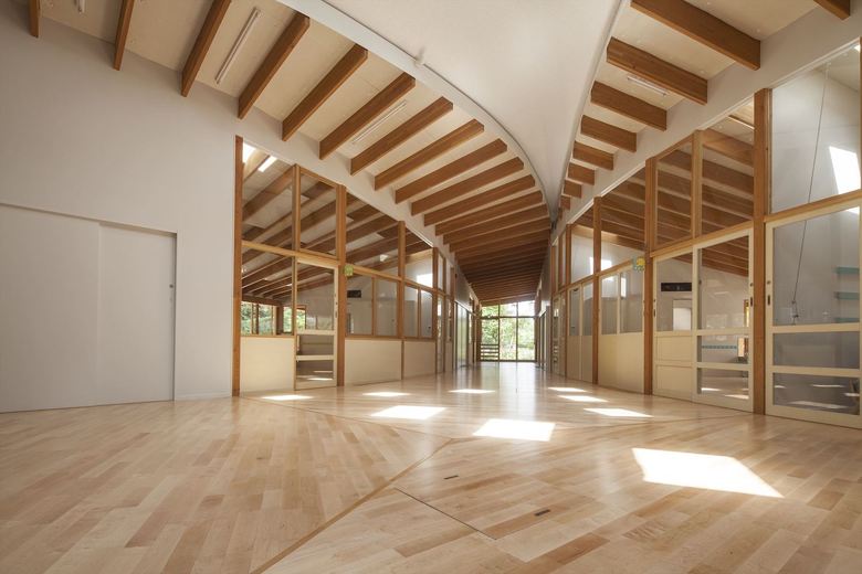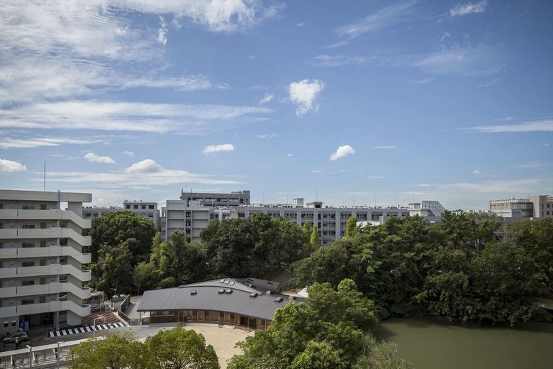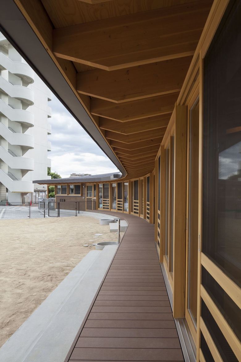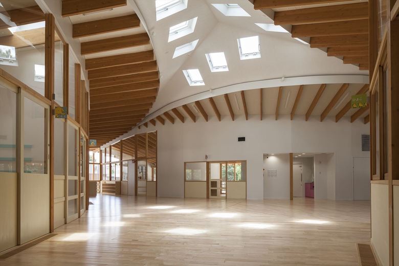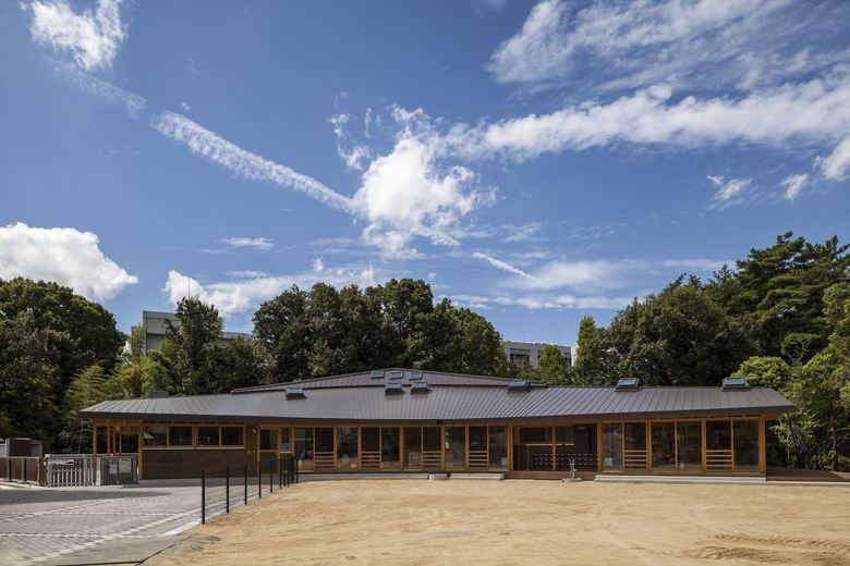 男女共同参画社会の実現・公共建築物木質化の先進事例として、大阪大学豊中キャンパス内に設計した大学関係者用の保育園。一日の多くの時間を過ごすもうひとつの「家」のような場所として、池や斜面など、大学キャンパス内のゆったりした多様な環境に面したロケーションを活かし3つの庭に面して三つ又に配置した諸室を、動線を兼ねたオープンスペースでつなぐ平面計画とした。深い軒先から廊下まで伸びた梁材が少しずつ長さを変え、ねじれながら中央のオープンスペースを覆って、象徴的な広場のような空間を生みだしている。ひとつ屋根で求心的でありながら、園庭や池のほうに走り出したくなるようなダイナミックさも兼ね備えた建築を提案した。