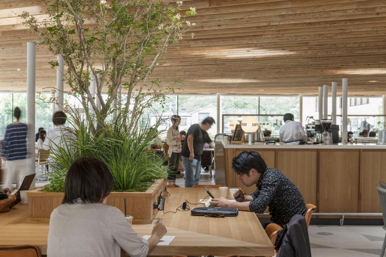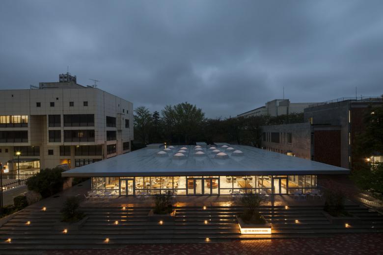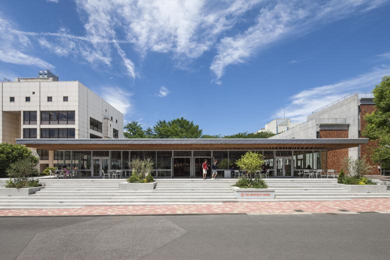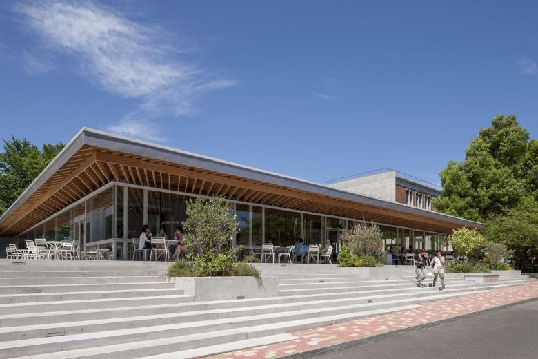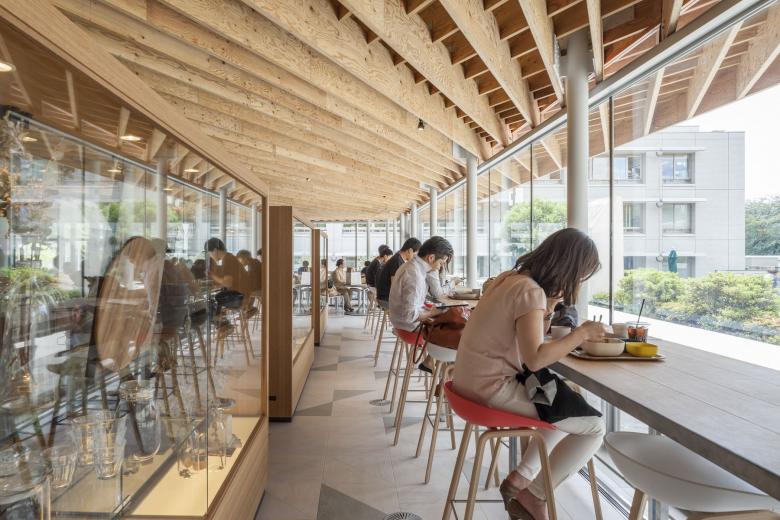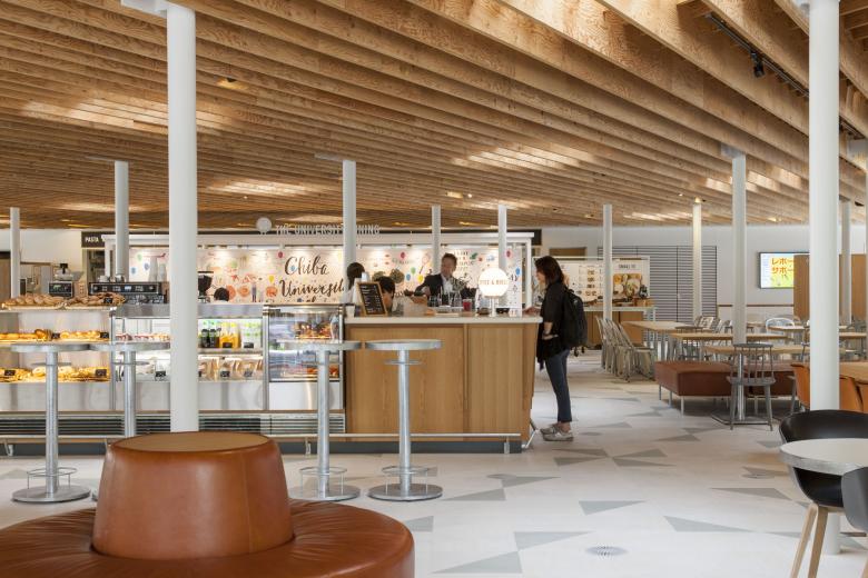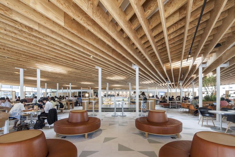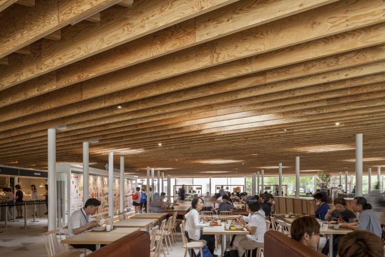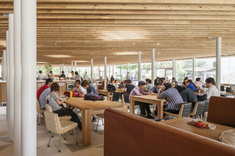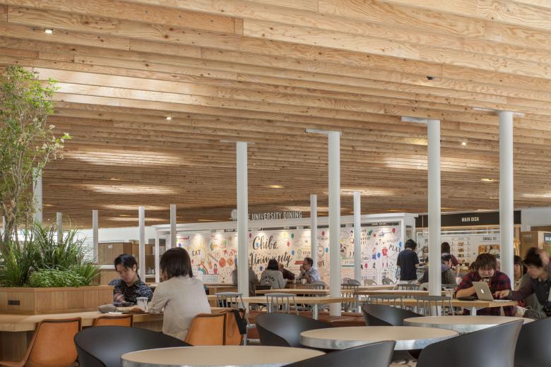 「The University DINING」は、いつでも学生達が自然と集い、新しい発想が次々と想像されるような環境を提供し、キャンパスライフの新しい拠点となることを目指しました。透明な外周は、外の環境と連動する快適な空間を創ると同時に、飲食はもちろん授業の合間の語らいや、少人数でのゼミなど様々な活動が、開かれた場で行われ新しい出会いが生まれる事を期待しています。建築は、自然界で人が心地よいと感じる1/fゆらぎのリズムをプログラム化し、構造解析と共に木梁の配列を決定しました。約1,000パーツのLVL材(単層板積層材)を上下2段に組み、細い鉄骨柱で支えています。木ピッチの幅を波のように振幅させることで、トップライトからの光を柔らかく変換しています。それは、木漏れ日のような優しい光に包まれた、インティメイトな空間を実現するためです。見る方向・座る場所によって様々な表情をつくりだしています。現在、学生はもとより地域の子育て世代や高校生も集い、高齢者の散歩コースの拠点となっています。学生教職員はもちろん、様々なゲストの方々が集い、生き生きとした交流が生まれています。