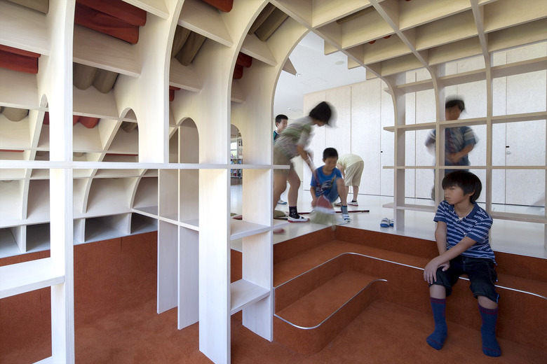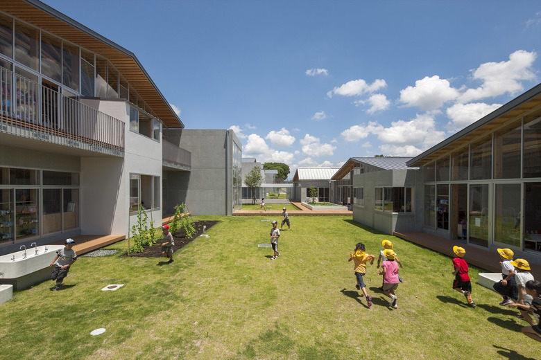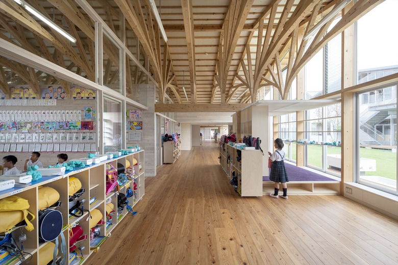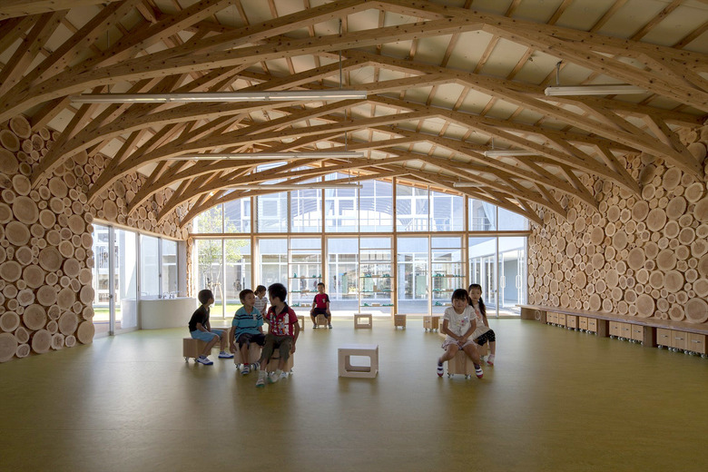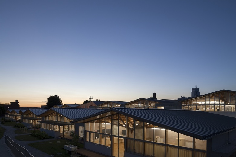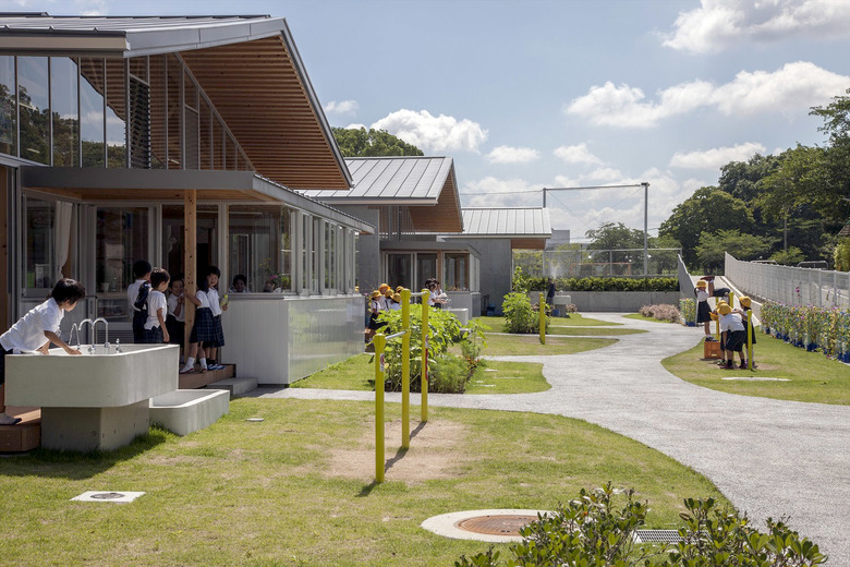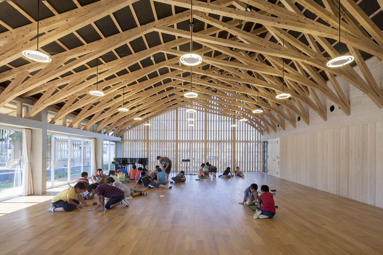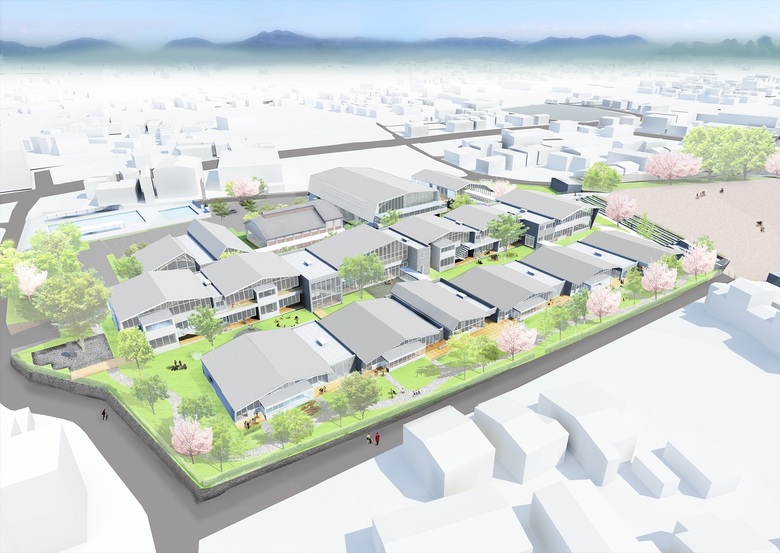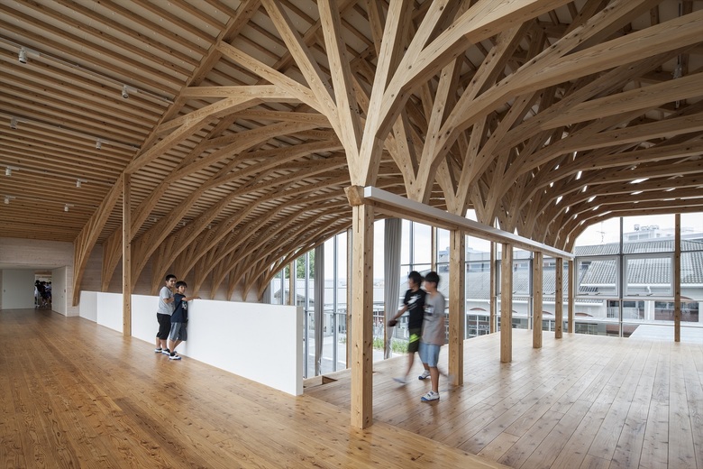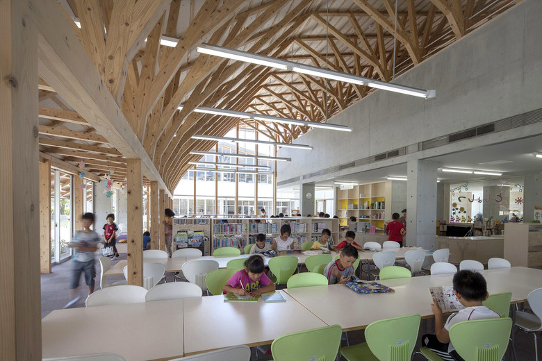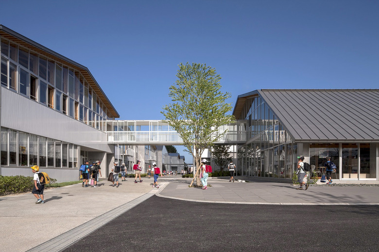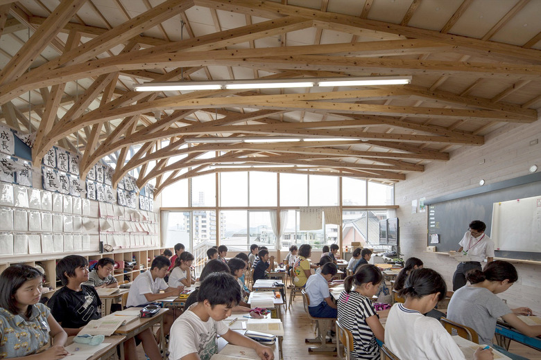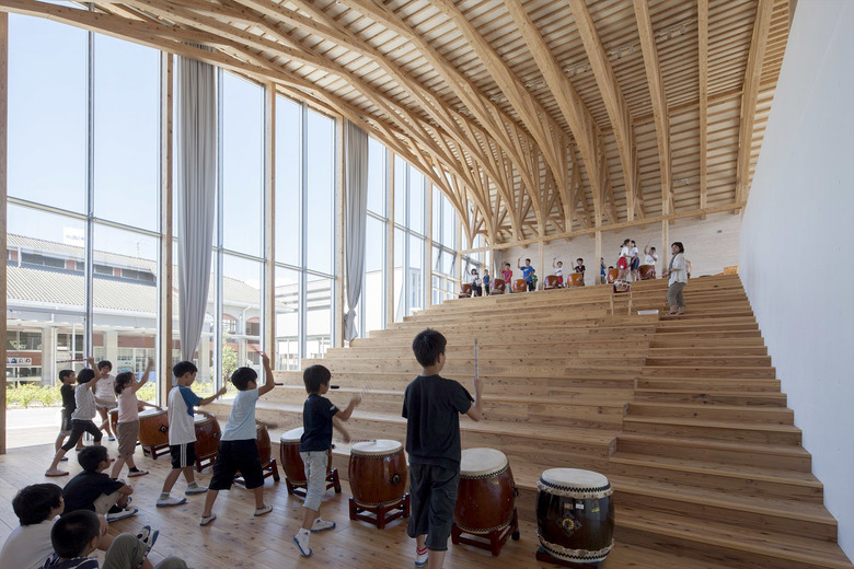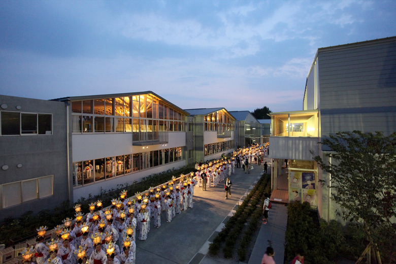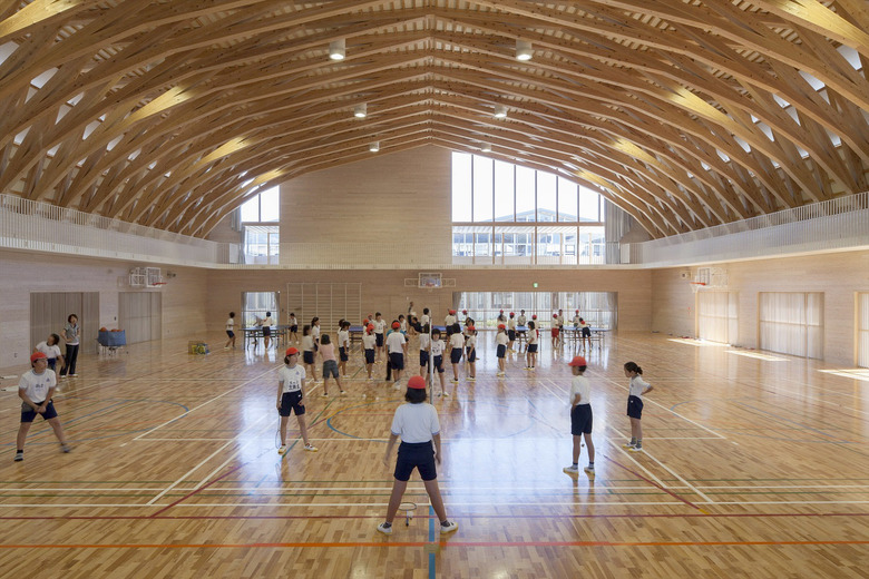 歴史的街並みが残り、自然に恵まれた山鹿市の中心地に建つ伝統校。105角~240角を扇状に組んだ架構は、木々の美しさを際立たせながら、明るく多様な学習空間を実現している。アプローチとなる「学びの街道」は、灯籠まつりの際には千人の踊り手に彩られる。教室はすべて「学びの原っぱ」に向かい、風・光・音で満ち溢れる。生活と学びと地域が室内外一体となり「幸せなローカリティ」を生み出し、これからの学校建築を牽引する。