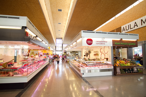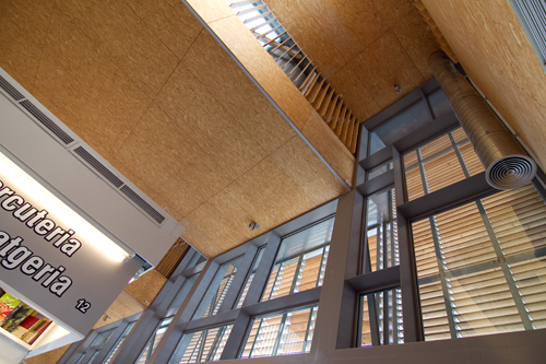 The new fresh products market is a Mediterranean building: the sales area is a large open space with the light as a protagonist, a controlled light filtered through a wooden slats system of the facades and inner skin panels and slats of wood shavings.