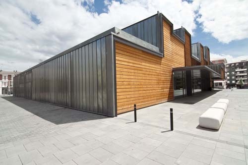 We used a dry semi-industrialized construct system to fulfill short timing (8months) and minimize the waste: metallic structure, sandwich wood panels in big format, wood slats, zinc roof and facades and interior OSB panels. All materials have natural finishes (wood and zinc). Passive systems (renewable energy heating and cooling systems (geothermal energy, heat recover machines,…), roof water collect tank and the possibility of dismantle and recycle all building materials) let to catch with an excellent energetic building work.